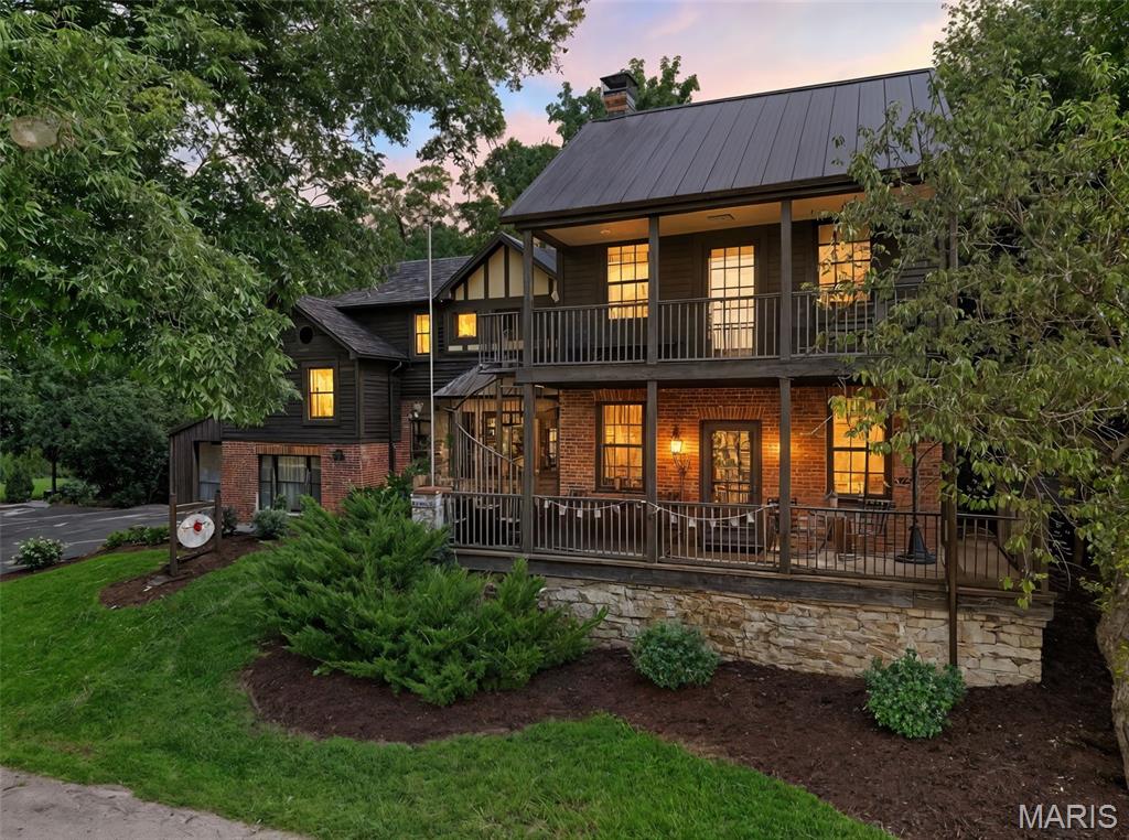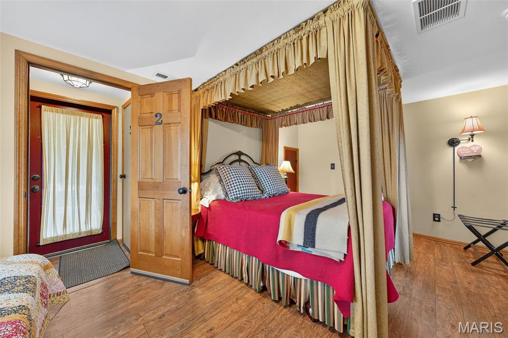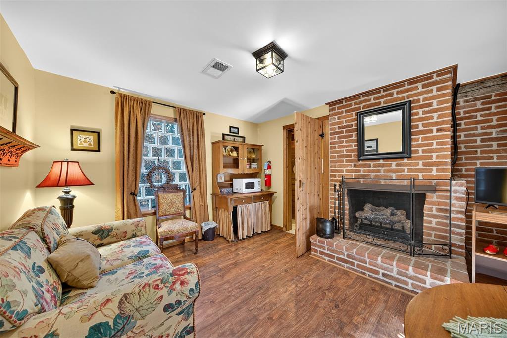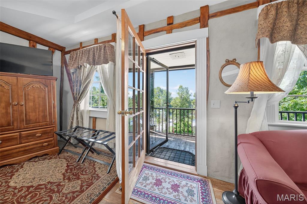 Welcome to The Applegate Inn. A beloved Bed & Breakfast (alternate use as primary residence) nestled in the heart of Augusta, Missouri, The Applegate Inn is a timeless retreat steeped in history and charm. Originally built in 1864, this beautifully preserved log cabin has seen thoughtful additions in the 1930s and 1980s, blending modern comfort with historic elegance. Much of the cabin’s original character endures—from its 24-inch stone walls and hand-hewn logs, to original brickwork, crystal door knobs, stained glass window, and authentic trim and hardwood flooring. The main house features: 3 spacious bedrooms 2.5 updated bathrooms A welcoming living room A fully equipped kitchen with adjoining breakfast room A separate dining room In addition, the property includes two private-entry suites, ideal for extended stays. Each suite offers: A cozy living room with a gas fireplace A full bathroom with sauna An efficiency kitchen Relax and take in sweeping views of Missouri Wine Country, America’s first designated AVA on the katy trail from the balcony with a spiral staircase, the outdoor deck, or the front porch. Situated on a private wooded lot, this property also includes an oversized two-car garage, patio, and is within walking distance to local wineries, shops, and restaurants. Nearby, discover the natural beauty of Klondike Park, offering hiking, picnicking, boating, swimming, and scenic river overlooks. Stroll the charming streets of this quaint, historic town, just 45 minutes from St. Louis. The Majority of furniture and contents will remain in the home. Duplicate listing MLS#25052135