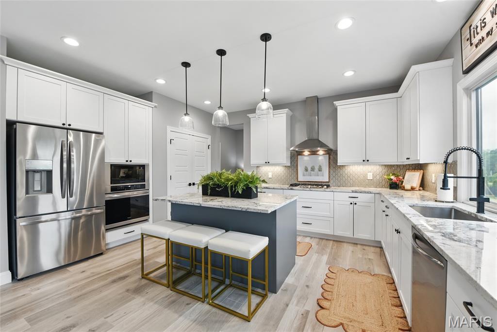 Welcome to Your Dream Home in the Heart of Flint Hill! This stunning two-story home with a spacious 3-car garage is nestled against acres of common ground and wooded views—offering both privacy and a picturesque backdrop. You are greeted with the elegant brick and LP siding, lush professional landscaping, and a full irrigation system that keeps everything looking its best. The inviting country-style front porch is the perfect place to relax and enjoy the quiet neighborhood atmosphere. Step inside to a bright, open foyer that flows into the den and dining room. The heart of the home is the welcoming great room, featuring a striking stone fireplace and seamless connection to the breakfast room and chef’s kitchen. You'll love the center island, custom cabinetry, granite countertops, stylish tile backsplash, stainless steel appliances, built-in oven, gas cooktop with custom hood, and a walk-in pantry. A convenient mudroom, laundry area, and half bath complete the main level. Upstairs, you'll find a large, cozy family room, a luxurious primary suite with a walk-in closet and spa-like bath, plus two more spacious bedrooms and a second full bathroom. The walkout lower level is full of potential with numerous windows that fill the space with natural light. The maintenance-free deck is ideal for outdoor gatherings with easy stairs to the backyard. Welcome home.