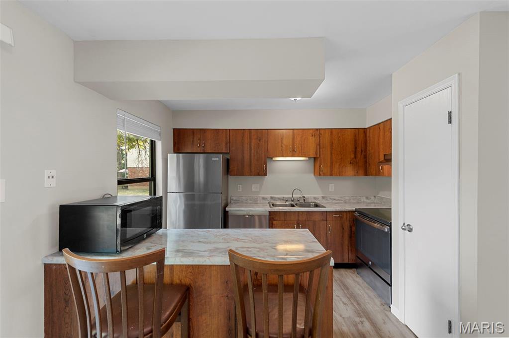 Welcome to 1907 High Sun Dr- this adorable 2 bed, 1 bath condo has been beautifully updated and meticulously maintained! The open concept living space is light filled and airy- lined with clean, light carpeting and perfect for entertaining. The kitchen features a breakfast bar, custom wooden cabinetry, and stainless steel appliances. Both bedrooms are generously sized and have ample closet space. The bathroom is outfitted with a large tub shower, modern light fixtures, and a sleek vanity. Basement storage offers tons of extra space. The HOA covers grounds maintenance, snow removal, landscaping, and more, making for easy living. Washer and Dryer stays with the property!