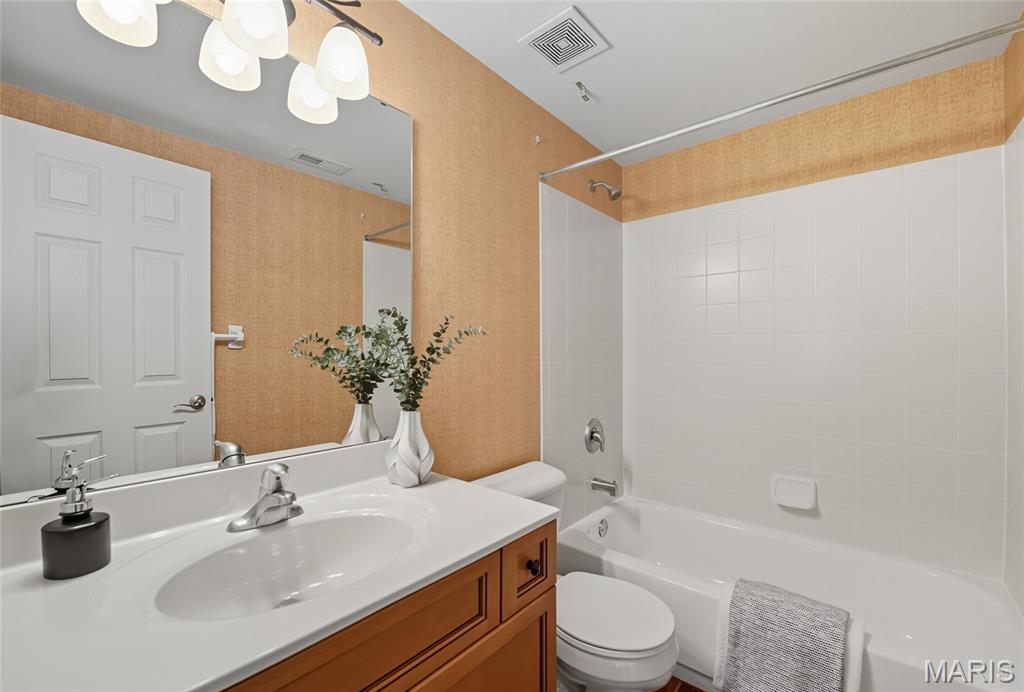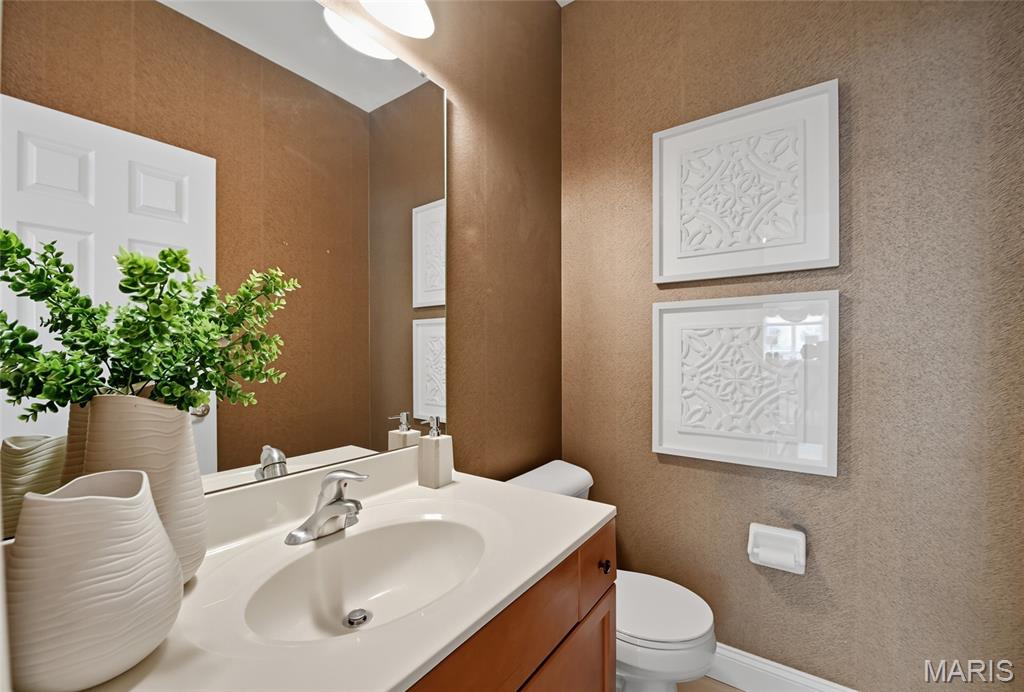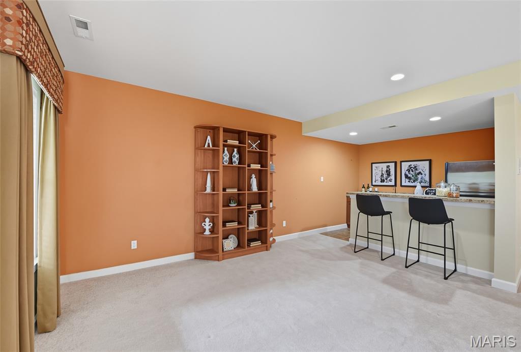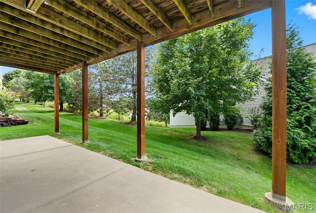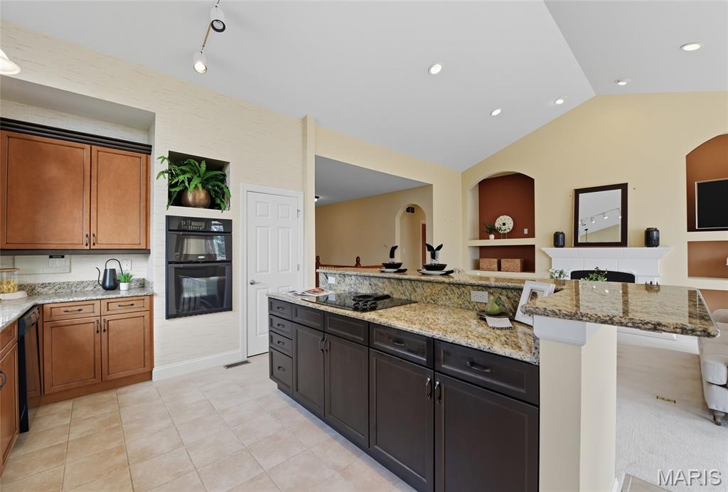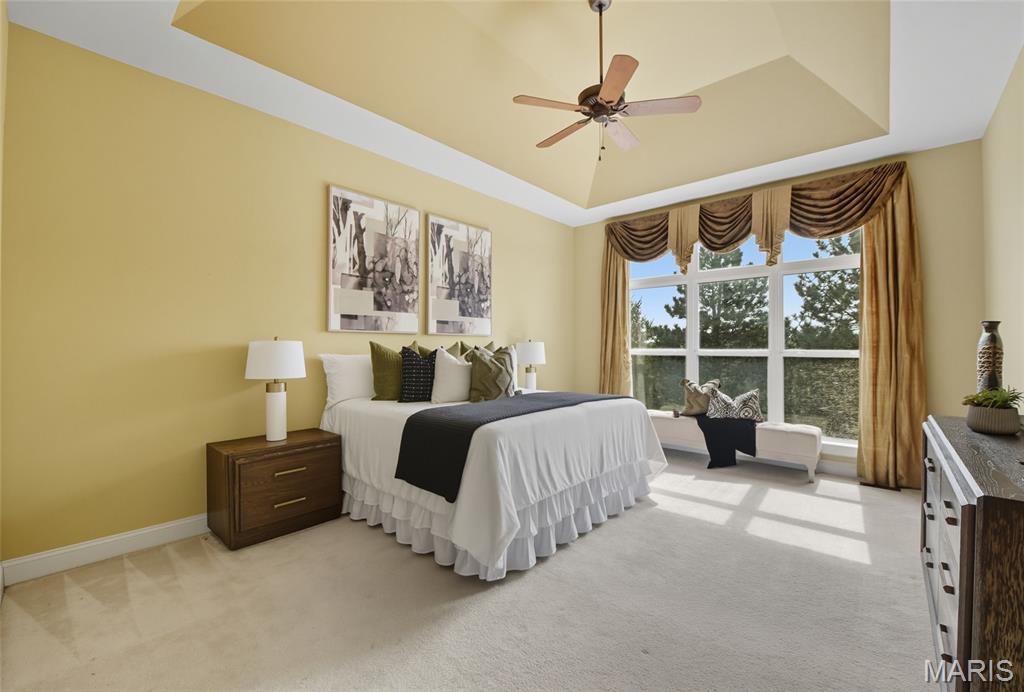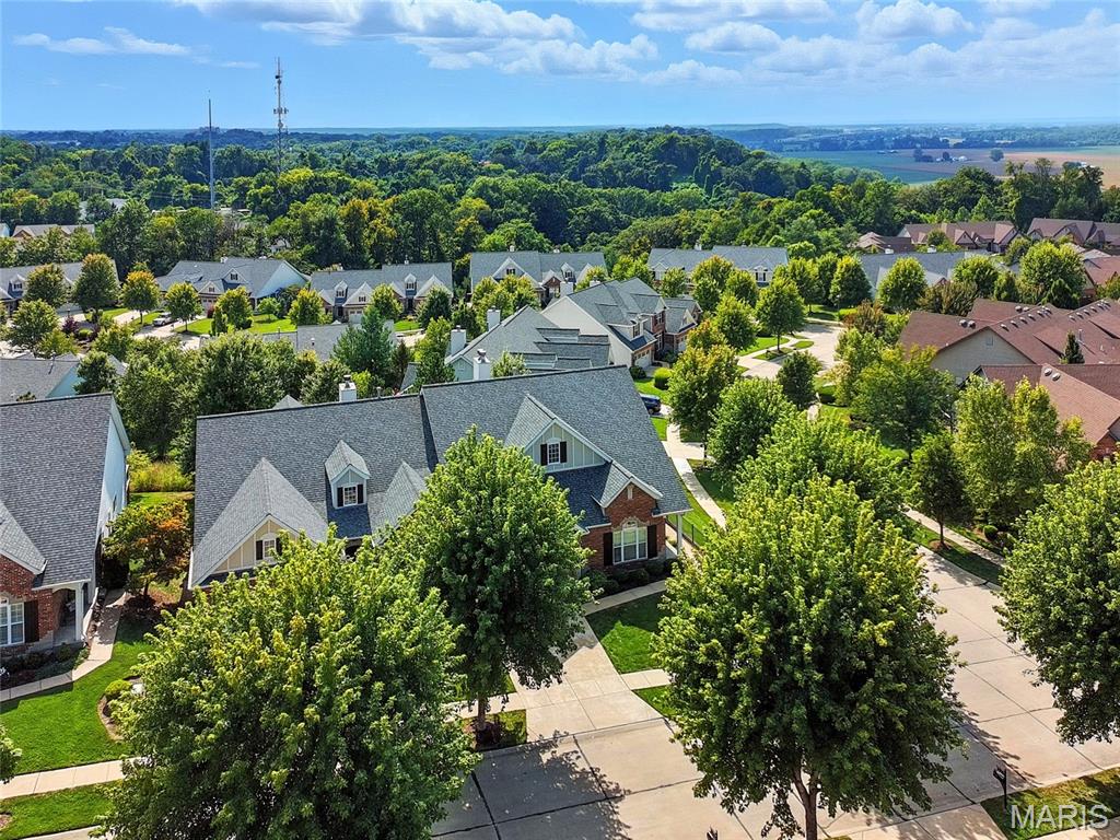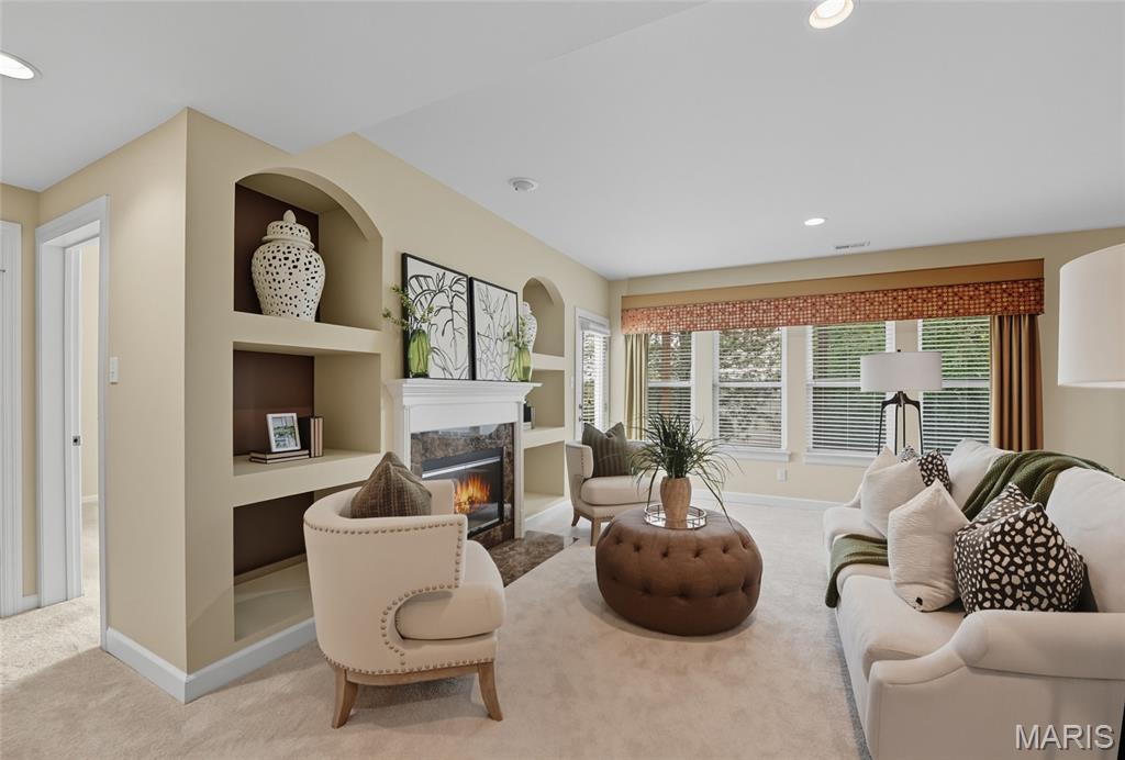 Welcome to the Villages of Kendall Bluff, a gated, low-maintenance community offering a carefree lifestyle! This stunning Calgary model villa - 2-bedrooms, 2.5-bathrooms - sits on a premium corner lot, elevated for exceptional views. This one-owner, former display ranch villa boasts an open floor plan with upgrades throughout. Curb appeal leads to a side entry with a long-covered porch. Inside, beautiful ceramic tile flooring welcomes you. To the left, an office with French Doors and built-ins, and across, a formal dining room with an intricate tray ceiling. At the heart of the home, the Vaulted Great Room flows into the kitchen, ensuring seamless interaction. A striking fireplace with towering built-in display shelves and a wall of windows create an inviting space. Don't forget your private deck right off of the kitchen that is ideal for entertaining or relaxation. The spacious vaulted primary bedroom features a large en-suite bathroom, double sinks, separate tub & shower with walk-in closet. The lower level expands the living space, offering another fireplace, built-in display shelves, rec room, wet bar, full bath, bedroom, and additional sleeping room. Plus, enjoy ample storage and a walkout patio! All of this plus a 2-car garage, main-floor laundry and a prime location near Chesterfield parks, shopping, dining, highways and exciting new developments!