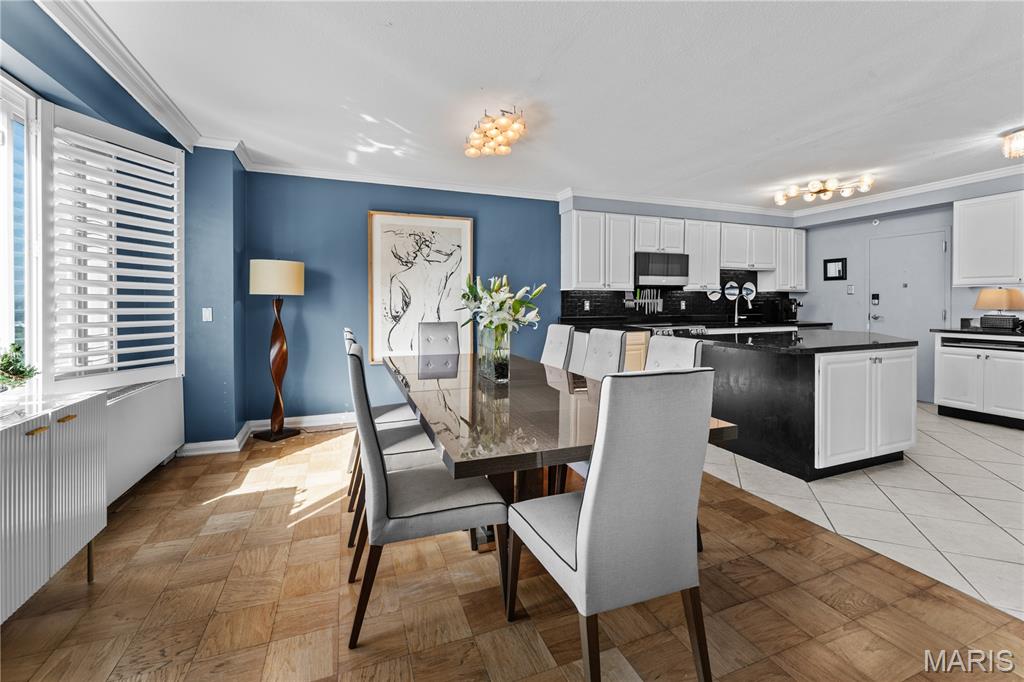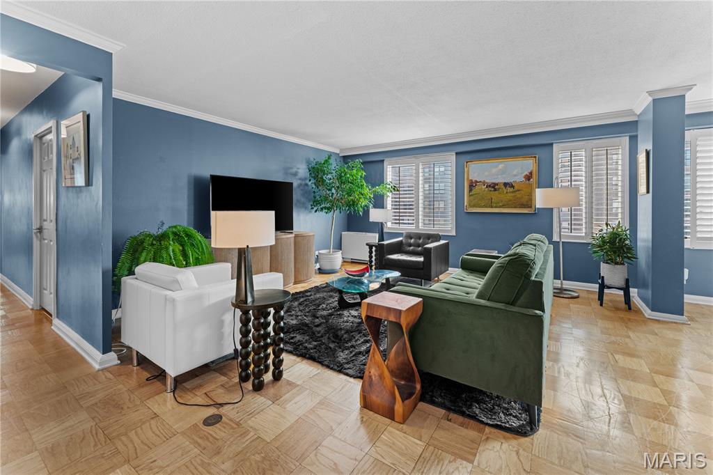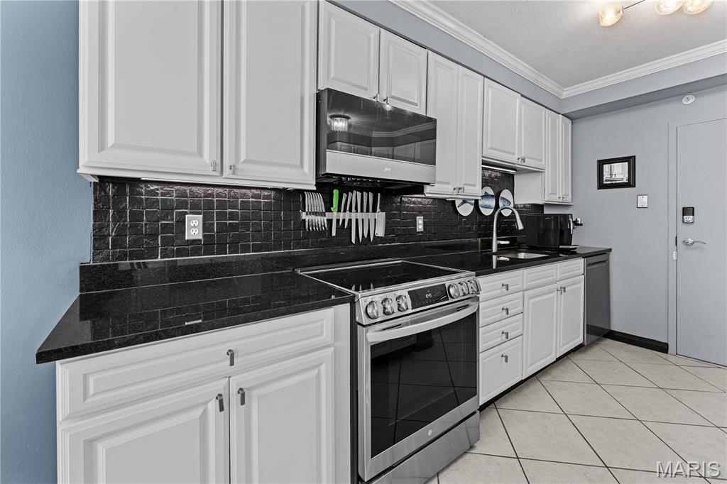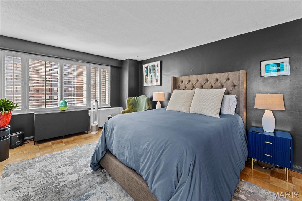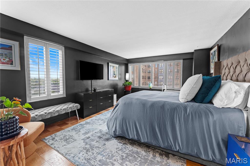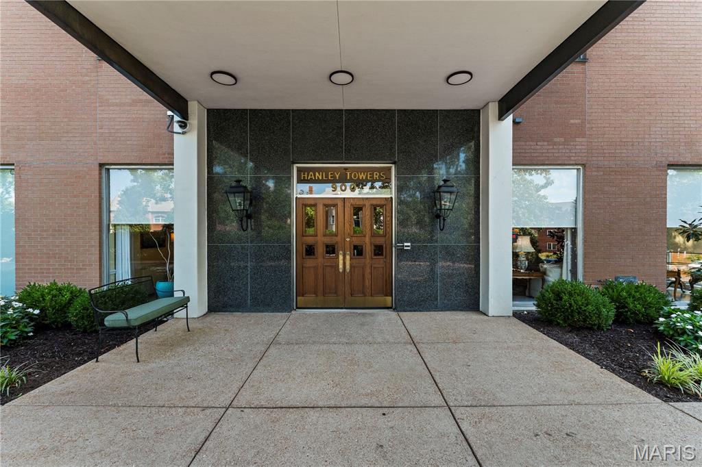 Prepare to be captivated the moment you enter this light-filled, corner unit. This spacious 2-bedroom, 2-bath condo boasts an open floorplan designed for both comfortable living and elegant entertaining. The gourmet kitchen features a generous center island with granite countertops, custom white cabinetry, and stainless steel appliances, seamlessly flowing into the dining area. Off the dining room, the living room has oversized windows filling the space with natural light. The spacious primary suite includes a walk-in closet and a beautifully renovated bath. A second bedroom and full bath provide ideal accommodations for guests or a home office. Additional highlights include in-unit laundry with washer and dryer, a welcoming foyer with marble flooring, and plantation shutters throughout. Enjoy panoramic Eastern views—including the Arch—from the primary suite, and Southern exposures from both bedrooms and the main living spaces. Located on an upper-level end unit in a full-service building featuring a 24-hour doorman, elegant lobby, dog park, fitness center, and in-ground pool. All just moments from the heart of downtown Clayton and within the acclaimed Clayton School District. New electrical and plumbing in 2022. New painting in 2024.