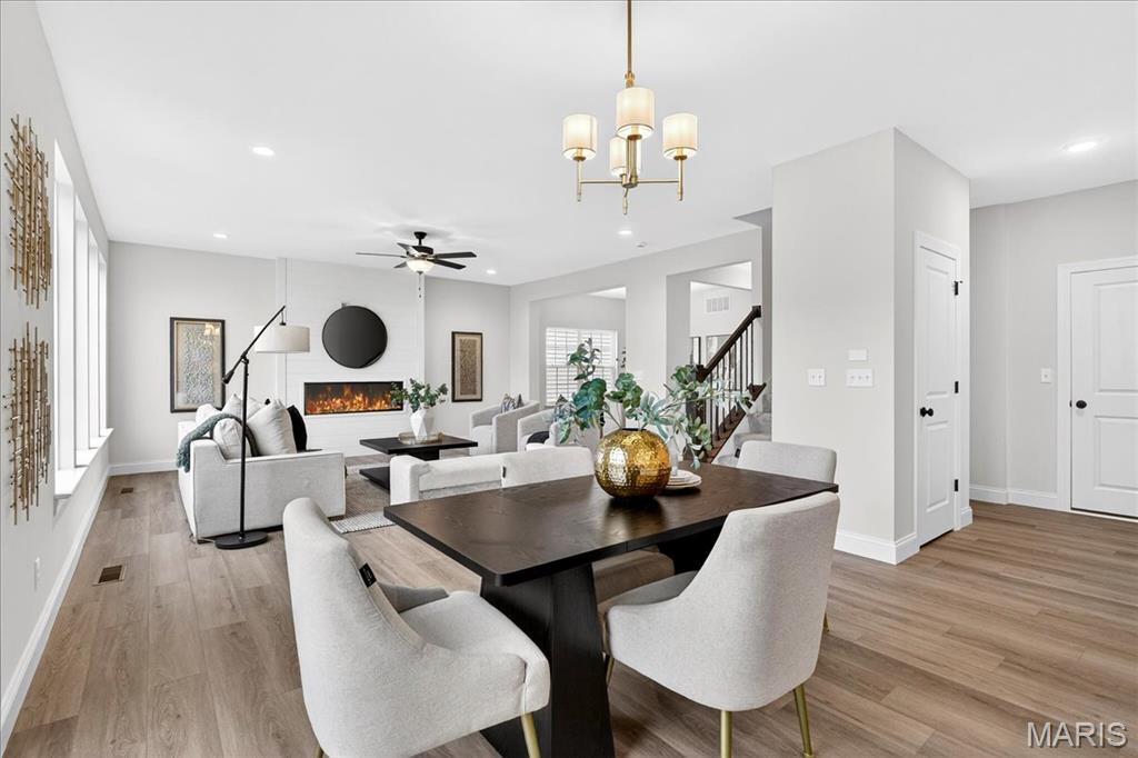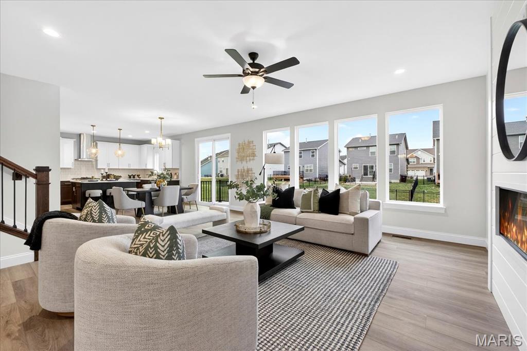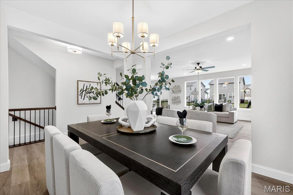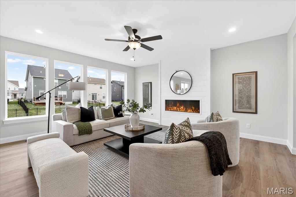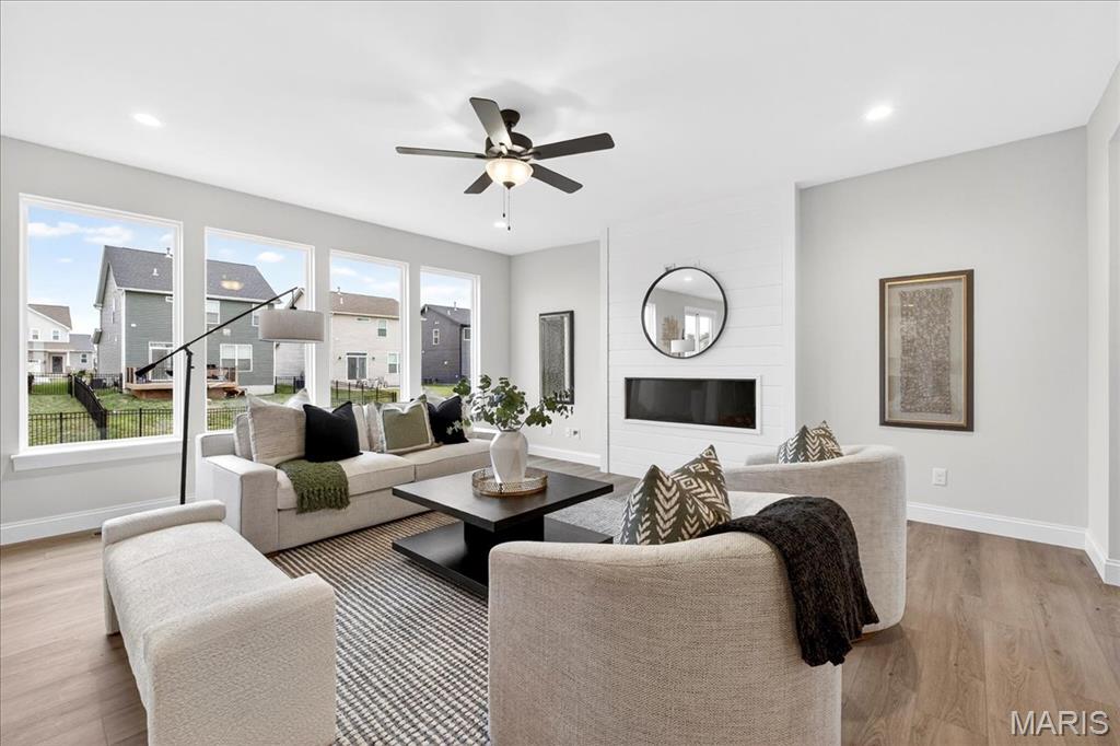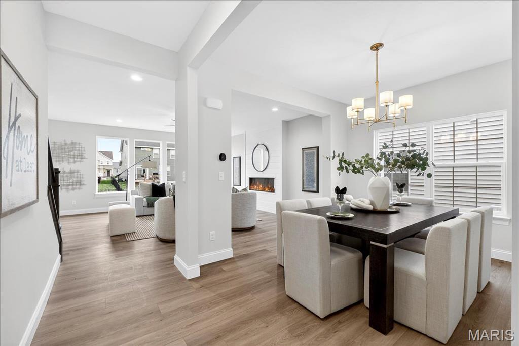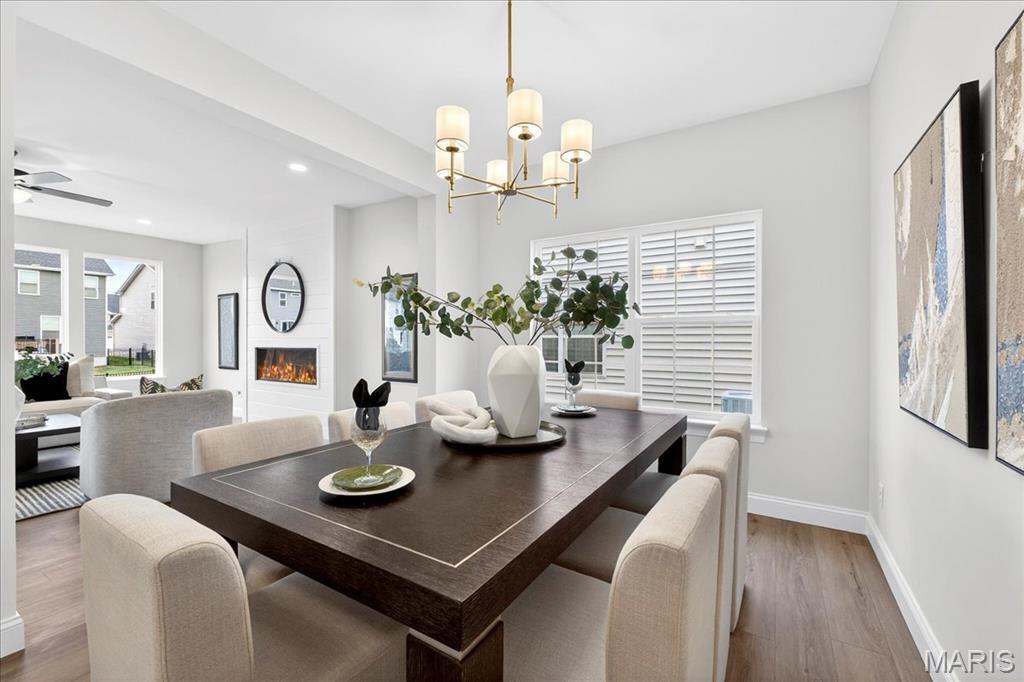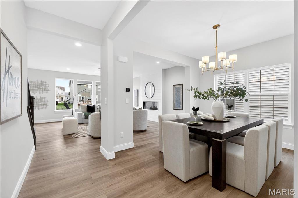 MOVE IN READY! Welcome to the Lancaster in desirable Cottleville Trails! This beautifully crafted 2-story home offers 2,892 sq ft, 4 bedrooms, 3.5 baths, and a 3-car attached garage with opener. The kitchen features quartz countertops, 42" soft-close cabinets, crown molding, dovetail drawers, stainless gas appliances, a walk-in pantry, pendant lighting, and a dedicated refrigerator cabinet. The main level is finished with luxury vinyl plank flooring throughout the family, living, kitchen, dining, and breakfast rooms. Upstairs, the primary suite features a walk-in closet, ceiling fan, and a spa-like bath with a double vanity and glass-swinging shower door. Three additional bedrooms include future ceiling fan bracing, and the second-floor laundry offers everyday convenience. Additional highlights: electric fireplace, window wall, recessed can and coach lighting, smart thermostat, bonus room, soaking tub, carbon monoxide/smoke detectors, 8' basement pour, rough-in bath, and landscaping. Zoned damper HVAC and insulated windows. Located in the sought-after Cottleville Trails with pool, trails, and quick access to schools, dining, shopping, and parks.