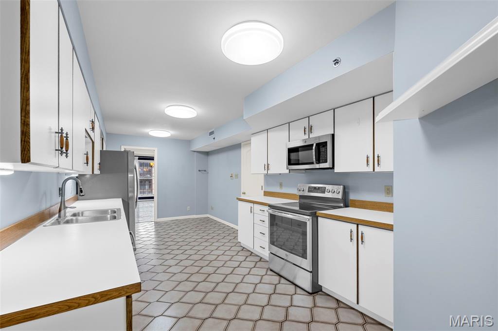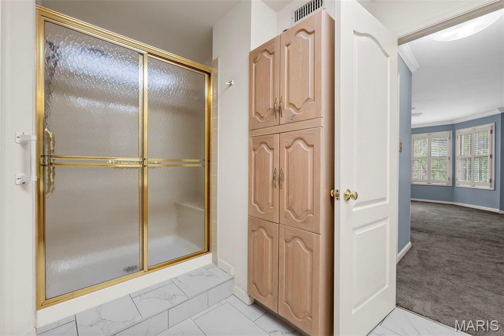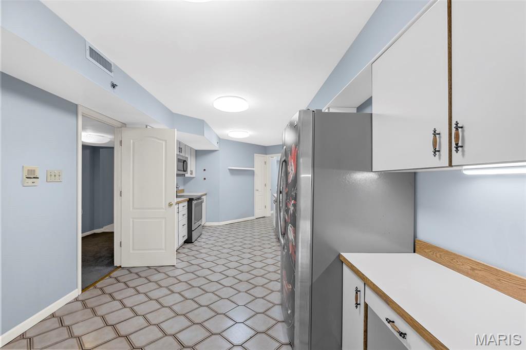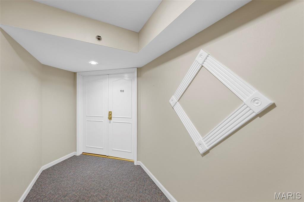 Welcome to 561 Sarah Ln #103—an end-unit, ground-level condo in Creve Coeur. This spacious 3-bed, 2.5-bath home offers one-level living with a large living room, built-ins, formal dining, and eat-in kitchen. The primary suite includes a walk-in closet, double sinks, separate tub, and shower. Two bedrooms share a Jack-and-Jill bath, and one has built-ins—perfect as an office. Enjoy a full laundry room, pantry, entry closet, and private storage room. Features include plantation shutters, smart thermostat, and newer gas appliances: oven/range, microwave, furnace, AC, and water heater—all just 4 years old. Includes two garage spaces (#11 & #12), storage locker, and elevator access. Common areas: lobby, club room, and pool. All that plus 3 months of HOA paid in advance! Ready for your updates!