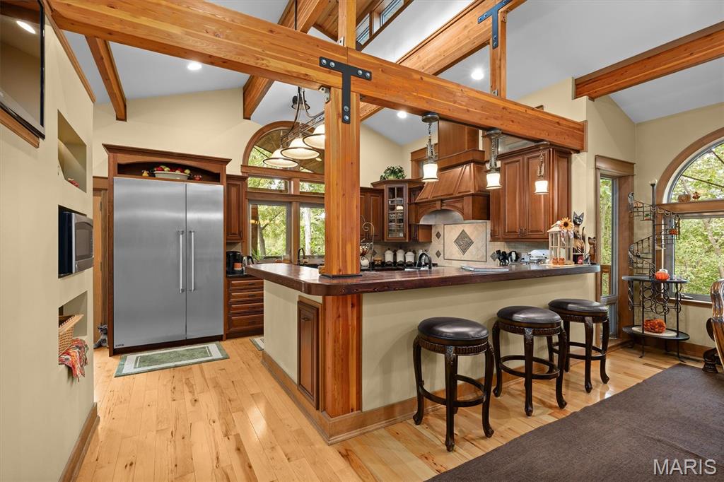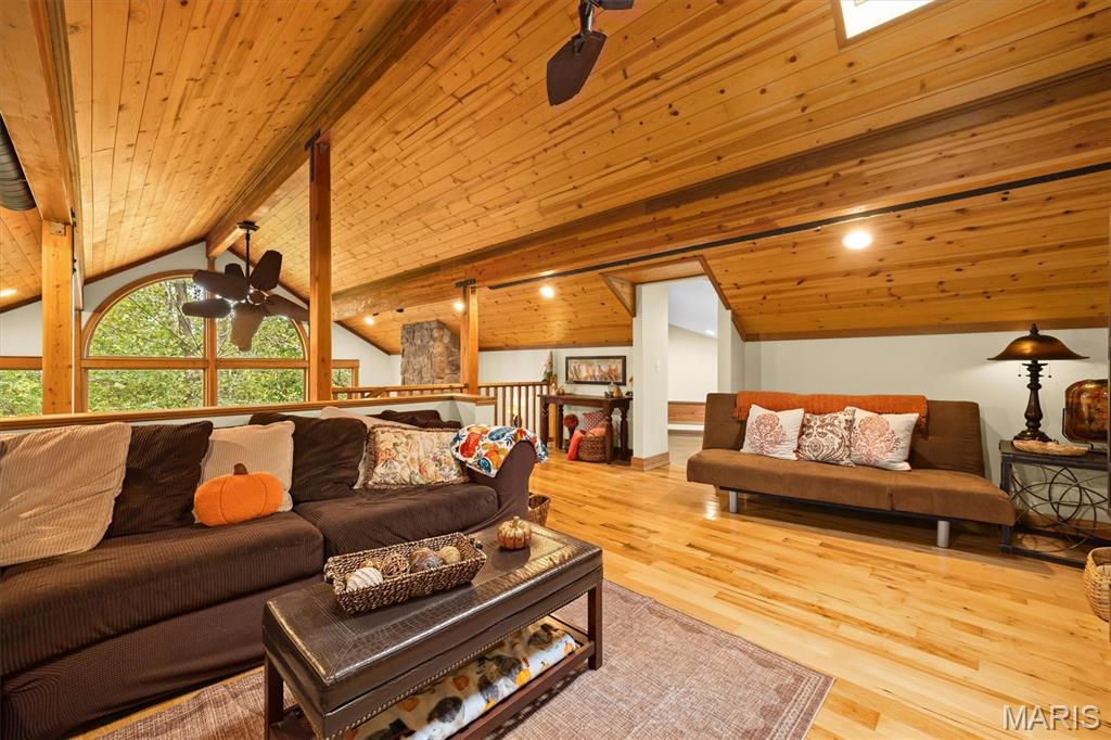 One-of-a-kind Lindal Cedar Home on 1 acre in the secluded Bluff Woods Estates Welcome to this stunning rustic retreat nestled among mature trees with sunset views. This custom built home offers soaring floor to ceiling windows that flood the interior with natural light. The main level features an open floor plan with a classic upscale kitchen, breakfast nook, walk-in food pantry, and a covered deck. A thoughtfully designed primary suite includes a full bath with walk-in shower, a closet with attached laundry, and a private screened in deck. The extra large two car garage Includes storage space and convenient entry into the home. Upstairs, you’ll find a versatile loft area with two spacious bedrooms connected by a Jack and Jill bath, and a bonus room. The walkout lower level provides it’s own living quarters with a large bedroom, full bath, kitchenette, laundry and additional oversized garage with private drive. Perfect for a multi-generational family. The complete lower level has radiant floor heating, even both garages. Outdoor living is just as remarkable with beautifully landscaped grounds filled with native trees and plants. This home is close to SIUE campus, interstates and the paved bike trails leading you into town. This unique home combines warmth, character, and location in a tranquil setting - truly a rare find. New roof 2024 Agent related to seller Buyers must have a Pre-Approval letter or Proof of funds letter provided to listing agent before viewing home.