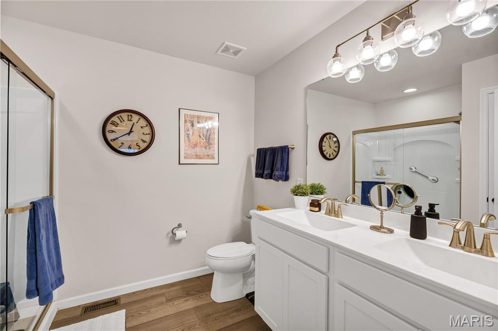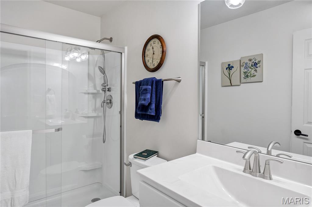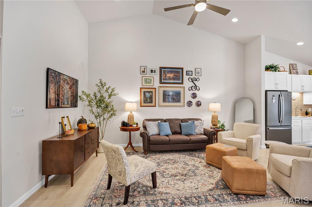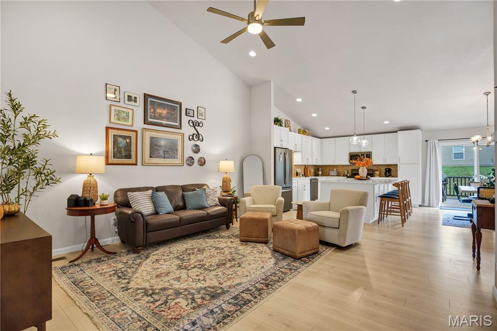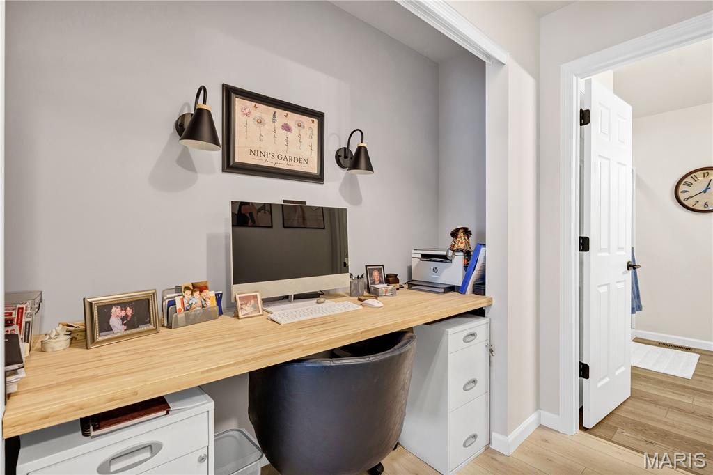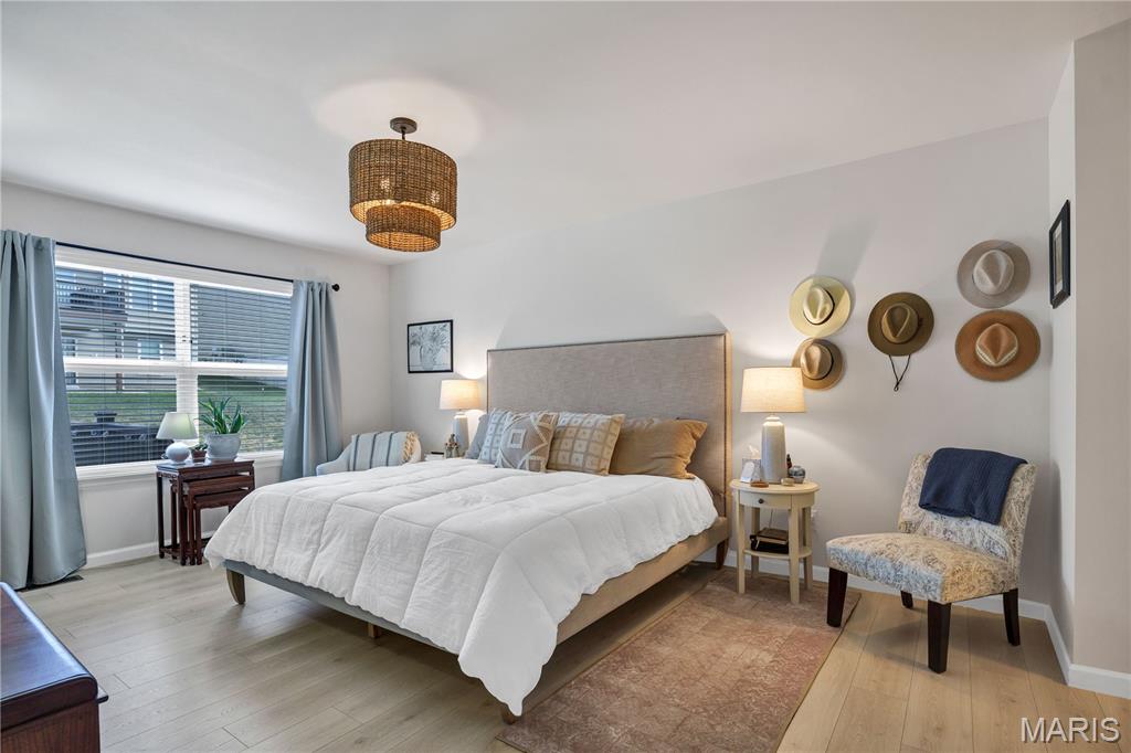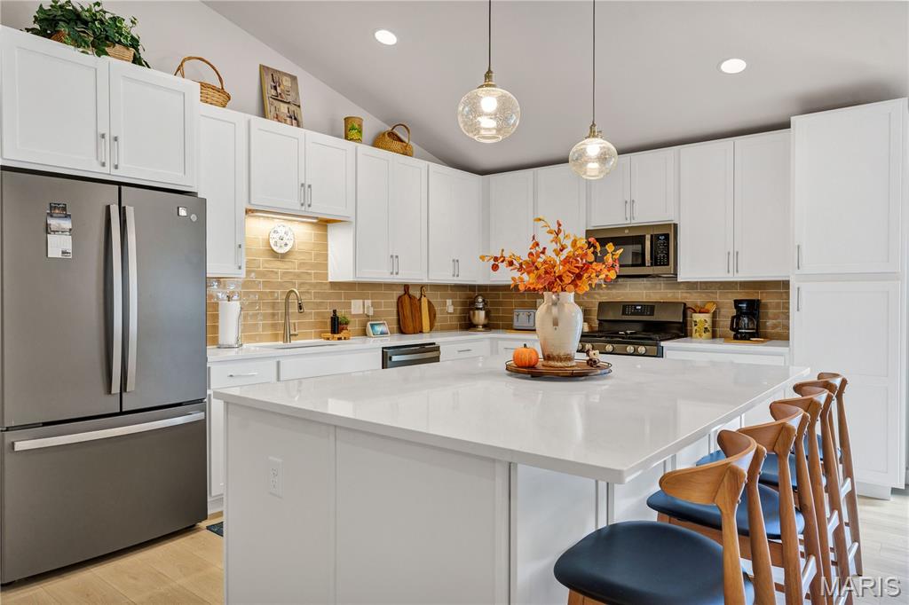 Welcome to this pristine 3-year-young Hawthorn Ranch Villa in the desirable Arbors of Rockwood, showcasing an impressive array of upgrades & thoughtful quality additions throughout. The open, vaulted design creates a bright & airy feel from the moment you enter and offers a seamless flow between the main living areas, enhanced by upgraded laminate plank flooring, custom lighting, & stylish finishes that flow beautifully from room to room. The designer Kitchen will impress with 42" soft-close cabinetry featuring dovetail drawers & pull-out shelving, Silestone counters, subway tile backsplash, large island with lovely, seeded glass pendant lighting, & sleek slate GE appliances including a gas/convection range. The adjoining dining area & spacious Great Room, with abundant recessed lighting & a lighted ceiling fan—creates the perfect setting for everyday living & entertaining. The Primary Suite features upgraded lighting, spacious walk-in closet, a custom built-in workstation (formerly a 2nd slider closet, with doors retained), & a luxurious private bath with adult-height dual wave bowl vanity, frameless glass shower doors, comfort-height toilet, upgraded fixtures, & luxury vinyl plank flooring. Bedroom 2, offering overhead lighted ceiling fan, and the second full bath continue the same high-end finishes with upgraded cabinetry, lighting, & flooring. Additional highlights include impressive board-and-batten detail & seeded glass pendant lighting in the vaulted foyer, upgraded hardware on all doors & cabinetry, multiple additional outlets thoughtfully placed—including convenient wall-mount TV outlets in the Great Room & both bedrooms, and upgraded lighting in nearly every room. Outdoor living is equally impressive with a low maintenance 16x12 composite deck, in-ground irrigation system with wireless rain sensor, & buried downspouts—all quality enhancements added new in 8/2022. Situated on a premium cul-de-sac lot where tree-lined views & trail access are enjoyed, this villa offers a peaceful setting within a community offering low-maintenance lifestyle with lawn, snow care & exterior maintenance included, plus walking & biking trails, lush common ground, a peaceful fishable lake with fountain & dog park. Move-in ready and better than new, this stunning villa combines quality upgrades, modern comfort, and effortless living in one of Eureka’s newer and desirable locations.