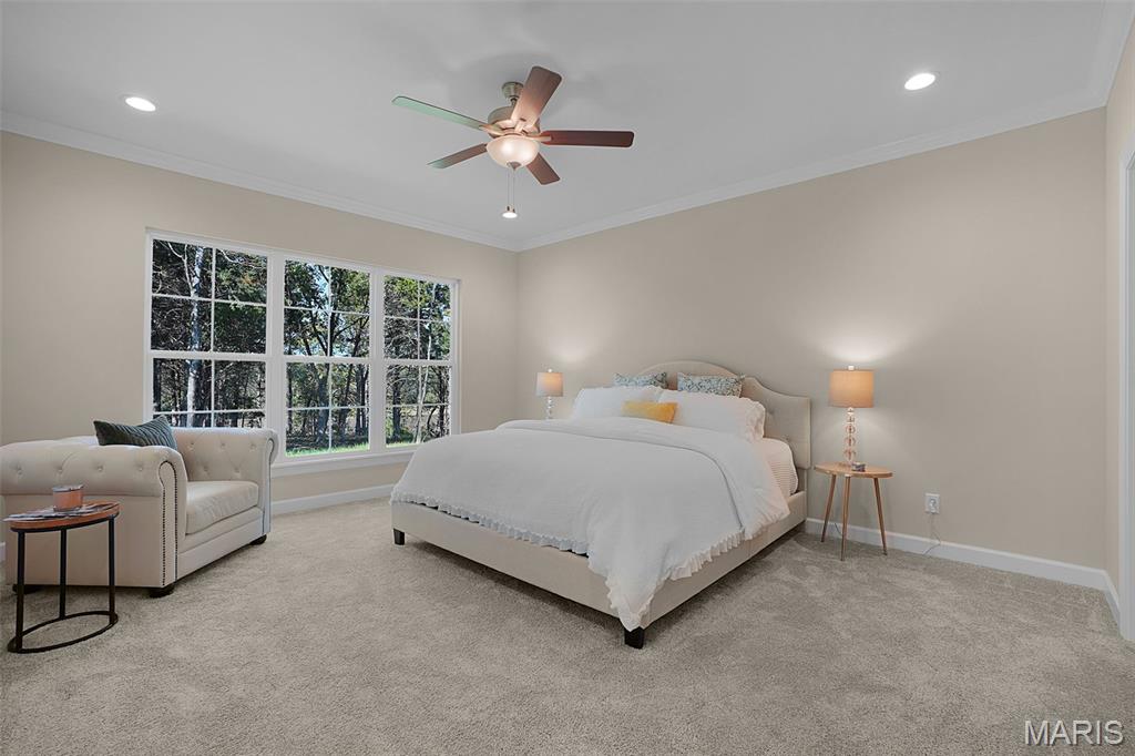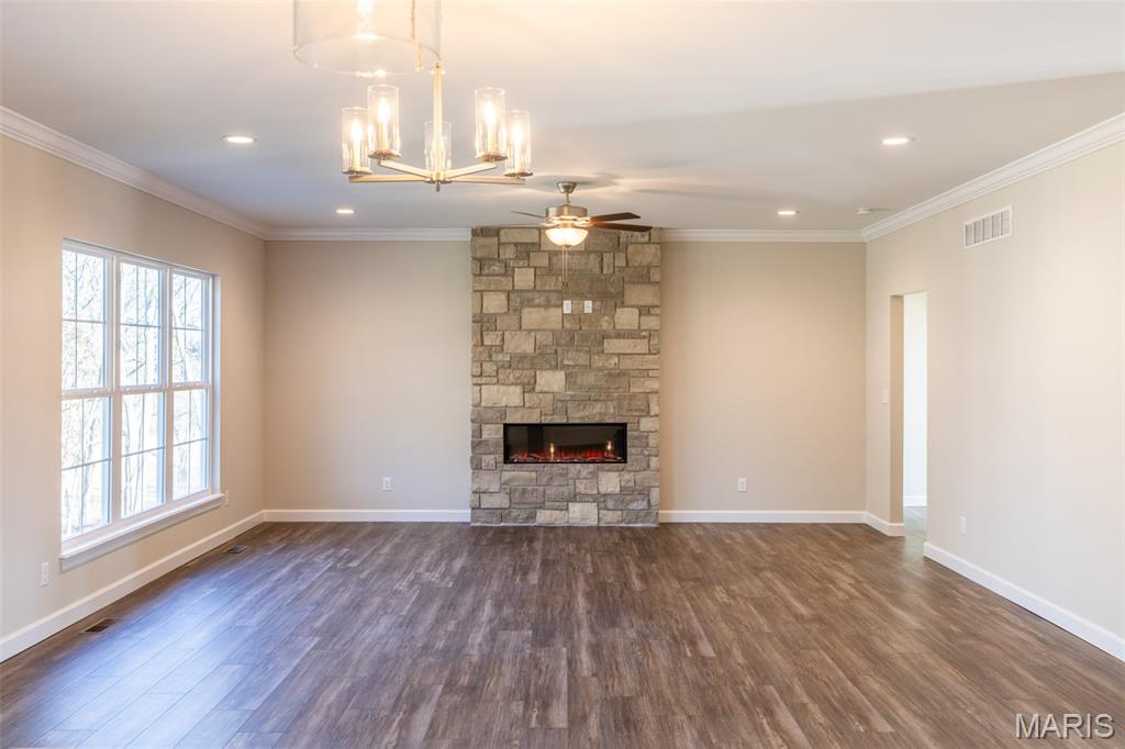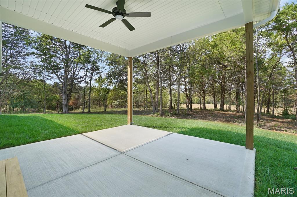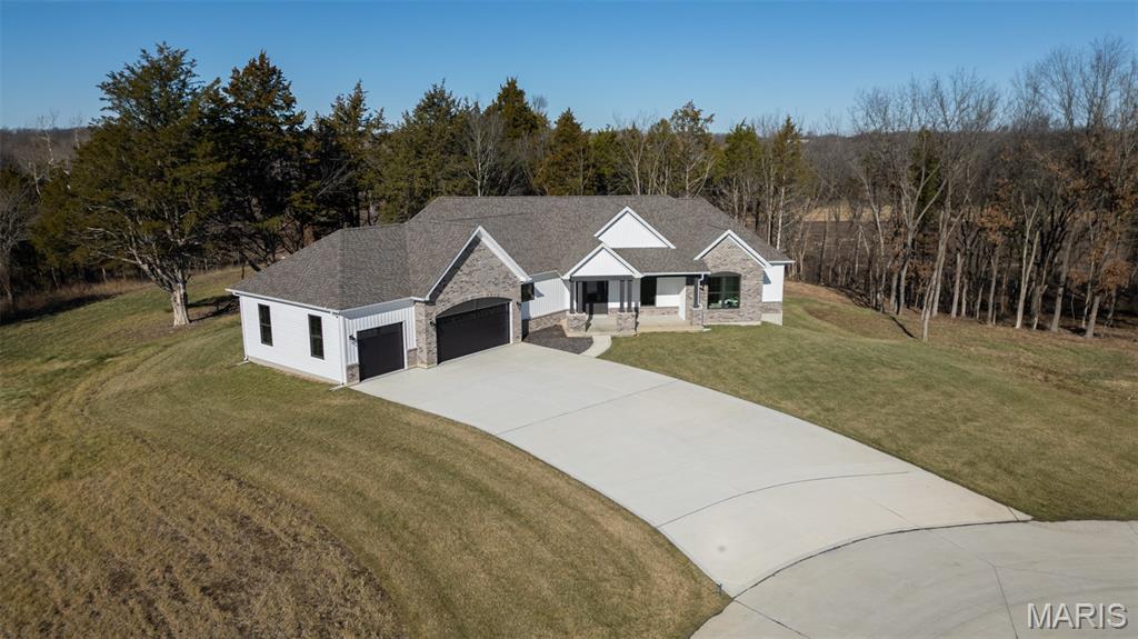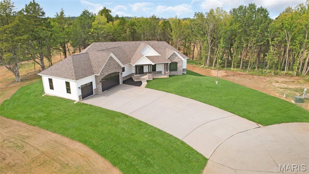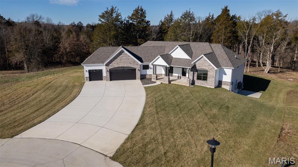 Huge Price Reduction! Now offered at $835,000 — well below today’s build price! This is the acreage home buyers wait for. Move-in ready new construction on 3.11 acres tucked on a quiet cul-de-sac in the highly sought-after Estates at Schaper Farms—offering privacy, space, and convenience without compromise. This Cypress Ranch by Jaeger Homes features an ideal split-bedroom floor plan with 2,432 sq ft on the main level, 3 bedrooms, 2.5 baths, and a separate office just off the foyer—perfect for working from home or a quiet retreat. The open-concept great room is anchored by a dramatic floor-to-ceiling stone electric fireplace and flows seamlessly into a fully upgraded kitchen package with 42” soft-close cabinetry, quartz countertops, double ovens, smooth-top range, farmhouse sink, cabinet hood, walk-in pantry, and a large island built for entertaining. Step outside to the covered patio and enjoy peaceful wooded views and a backyard that’s absolutely ideal for a future pool, outdoor firepit, or expanded entertaining space. The acreage truly sets this home apart. The private primary suite is a true retreat with dual vanities, soaking tub, oversized walk-in shower, and two walk-in closets, thoughtfully separated from the secondary bedrooms for added privacy. The side walk-out lower level with a 9 ft pour offers endless possibilities for future finish and additional living space. Car enthusiasts and hobbyists will love the extended driveway and oversized angled 3-car garage (31’ x 25’)—designed to accommodate larger vehicles—with a bump-out area perfect for extra storage or a refrigerator/freezer, plus a service door for added convenience. Additional highlights include an irrigation system, partially sodded yard, energy-efficient construction, city-maintained concrete streets, and low HOA dues. Enjoy the best of both worlds—private luxury acreage living just minutes from highways, Wentzville schools, dining, and shopping. Why wait to build and pay more? This exceptional home is move-in ready, loaded with upgrades, and priced to sell.