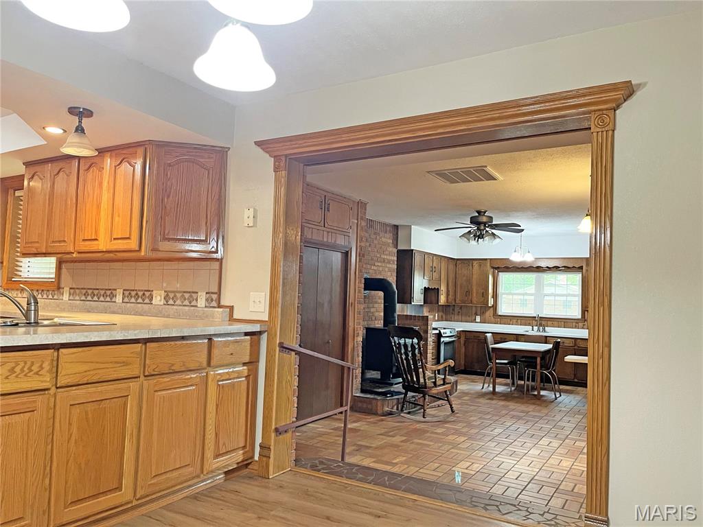 Located just outside Malden city limits, this well-maintained 3-bedroom, 2.5-bath home sits on a generous 110 x 330 ft lot, extending from Myers St to Bernard Rd. Inside, the bedrooms are accessed from the central hallway and the primary bedroom has a half bath for added convenience. The spacious kitchen and dining room combination flow seamlessly, with plenty of cabinet space and a built-in hutch. The dedicated laundry room houses the tankless water heater and has an exterior door leading to the carport. A cozy den with a wood-burning stove shares its space with a second kitchen and an adjacent 3 piece bathroom. This addition is ideal for a mother-in-law suite with its separate exterior entrance. Outside, enjoy a detached 2-car garage with work space and overhead doors. The tool shed, pump house, and portable carport are added bonuses, but leave plenty of room for play space, hobbies or future additions. Schedule a tour today!