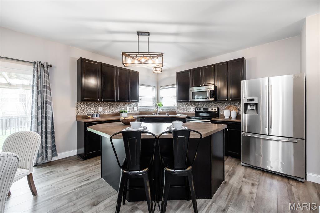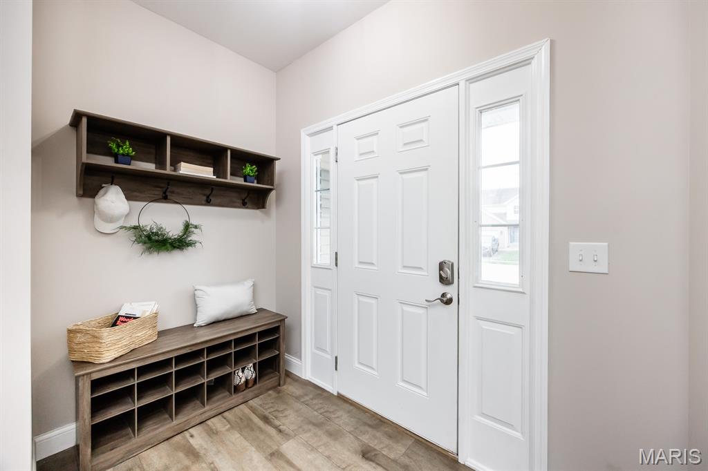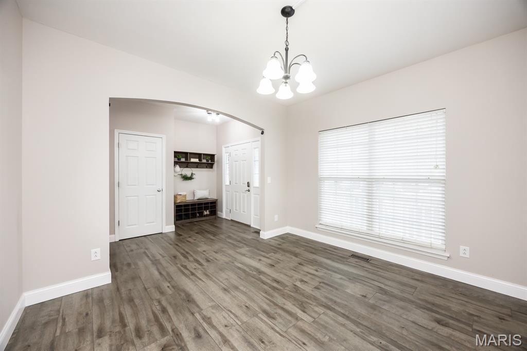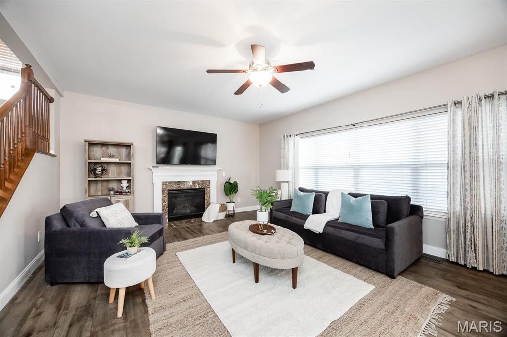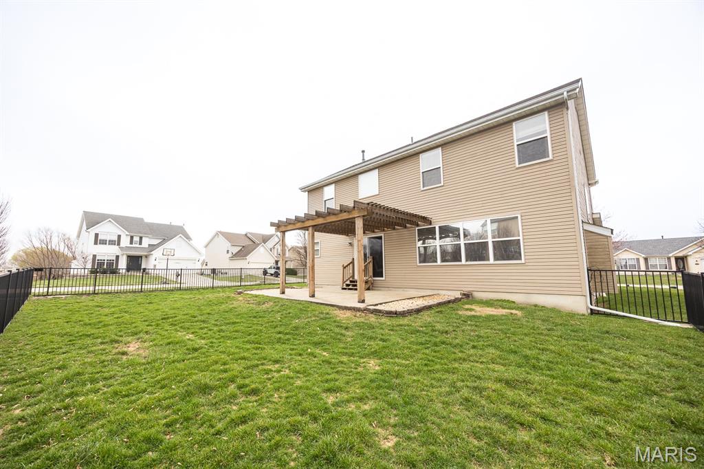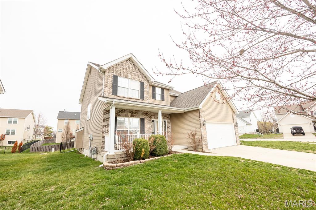 This two-story home is situated in the highly sought-after Plum Hill subdivision, Mascoutah School District, featuring 5 bedrooms, 3 1/2 bathrooms, and a 2-car garage. The exterior showcases an attractive brick and siding combination with well-maintained landscaping. The backyard offers additional storage and a large fenced yard with a patio shaded by an elegant pergola. Inside, the entry includes Newer luxury vinyl plank flooring leading throughout the main floor. The front office and formal dining room are accented by charming arched doorways. The main living space boasts an open-concept layout. The kitchen is equipped with rich dark cabinetry, backsplash, stainless steel appliances, a pantry, and a huge center island with seating. A generously sized breakfast area features a new sliding door leading to the backyard. The living room is filled with natural light and includes a gas fireplace. Upstairs, the spacious primary suite offers LVP flooring, a vaulted ceiling and walk-in closet featuring beautiful and functional custom cabinetry. The primary bath includes double comfort-height vanities, a separate makeup vanity, and a tub/shower combination. Three additional bedrooms and a full bathroom complete the upper level. The lower level offers comfort for the overflow with a rec/room-great room, a 5th bedroom and a 4th bathroom. The addition storage provides room for holiday supplies and other seasonal needs. Conveniently located near SAFB, MetroLink, highways, and shopping. Buyer to verify all information.