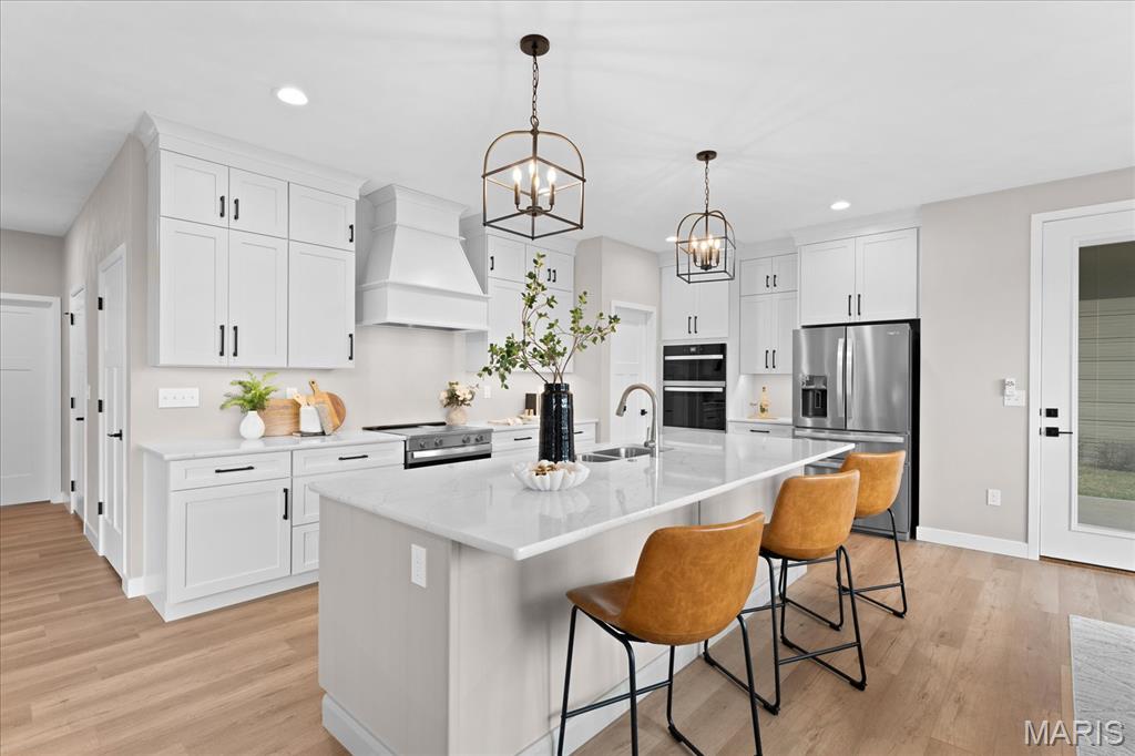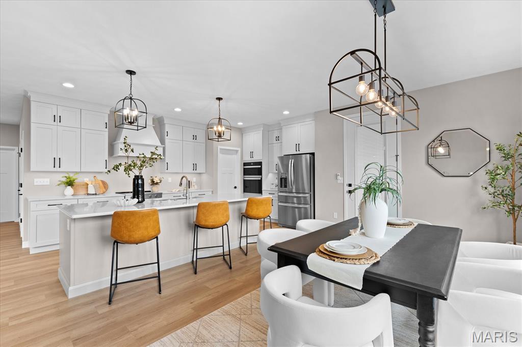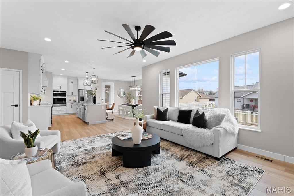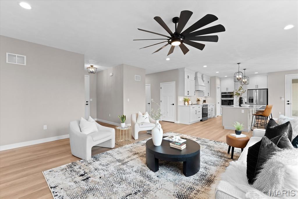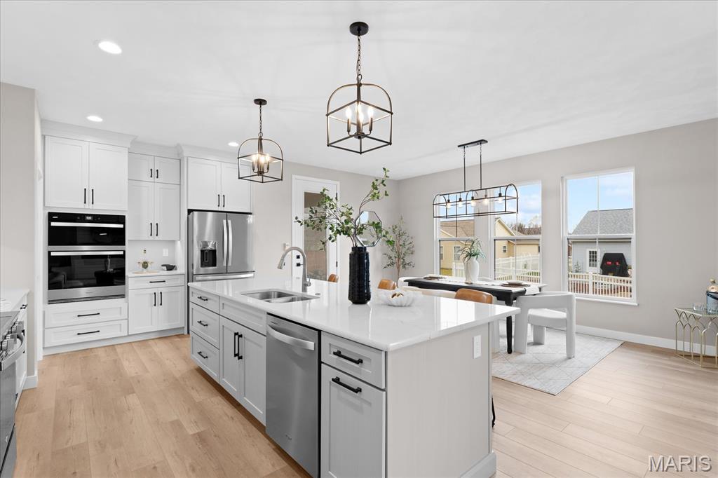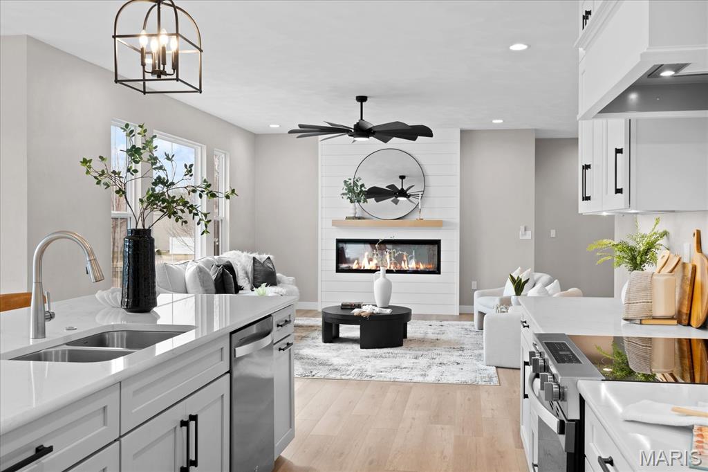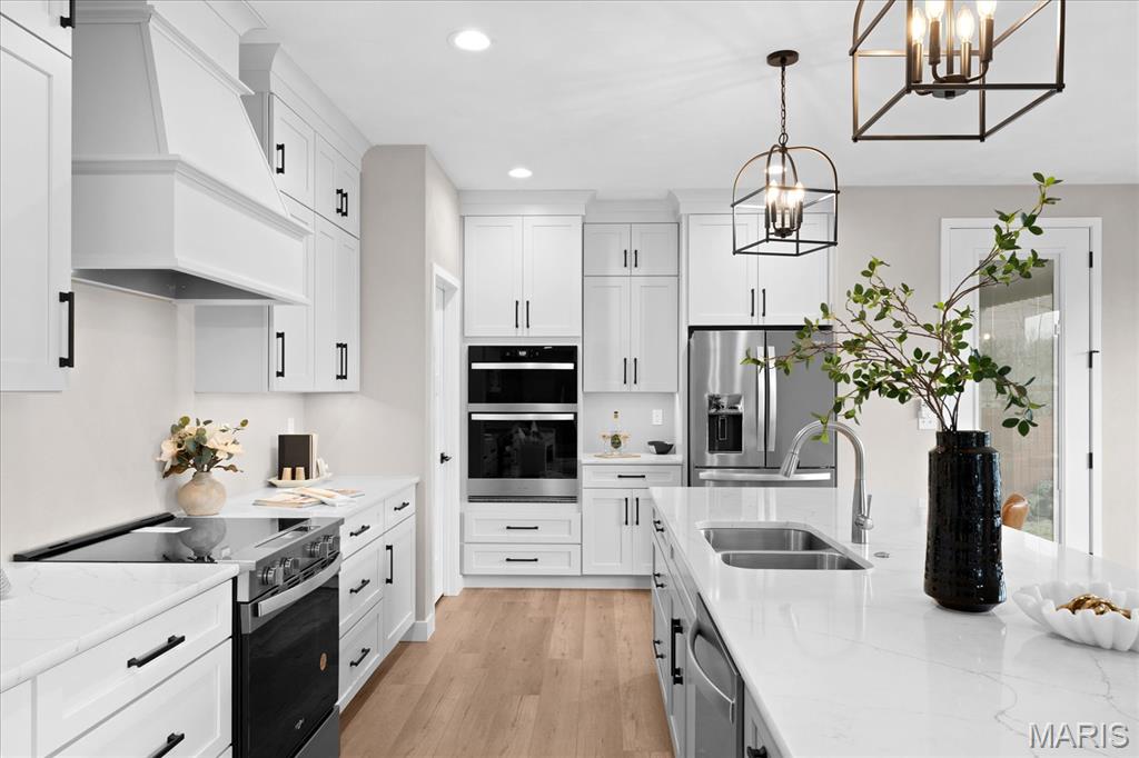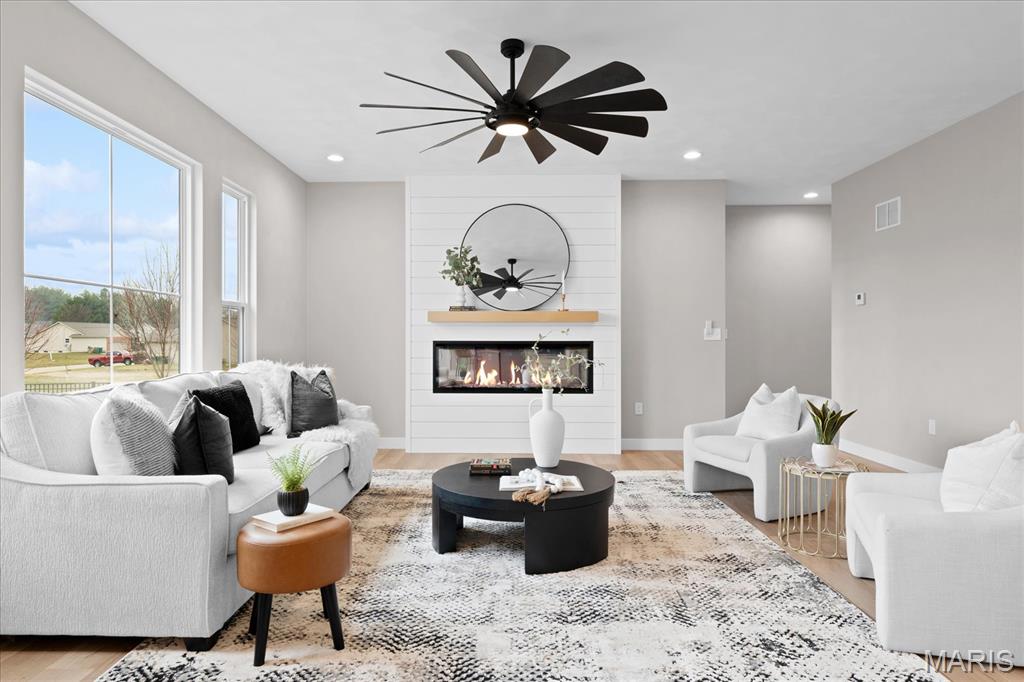 Stunning new construction ranch featuring 4 bedrooms, 3 bathrooms, and a 3-car oversized garage. The crisp white exterior with black accents delivers timeless curb appeal. Step inside this thoughtfully crafted home, to a spacious foyer that opens into a bright and airy living space with luxury vinyl plank flooring throughout and high-end finishes at every turn. The heart of the home is the open kitchen, dining, and living area—bathed in natural light. The show-stopping kitchen boasts floor-to-ceiling custom cabinetry, quartz countertops, a massive island, luxurious hood vent, and a custom walk-in pantry with built-ins. A covered back patio with ceiling fan offers a perfect space to relax or entertain. Off of the massive garage, a mudroom leads to a laundry room with cabinetry, sink, and hanging storage. The primary bedroom features a walk-in closet with custom built-ins, an ensuite bath with a double sink and tile glass shower. Additionally you have two other bedrooms and a full bathroom. The finished lower level adds 900 sq ft of finished living with 9' ceilings, a fourth bedroom, full bath, and storage area. Every inch of this home exudes thoughtful design and quality craftsmanship, don't miss the opportunity to call this home!