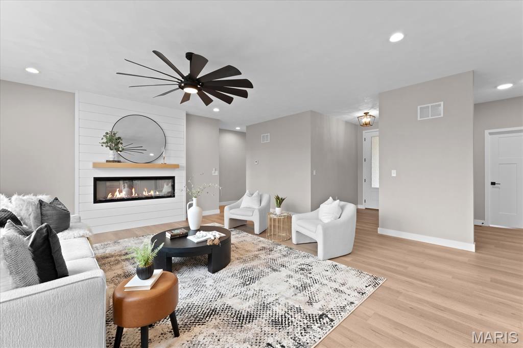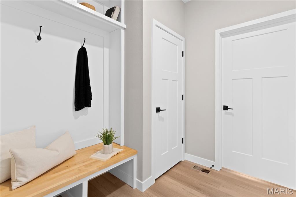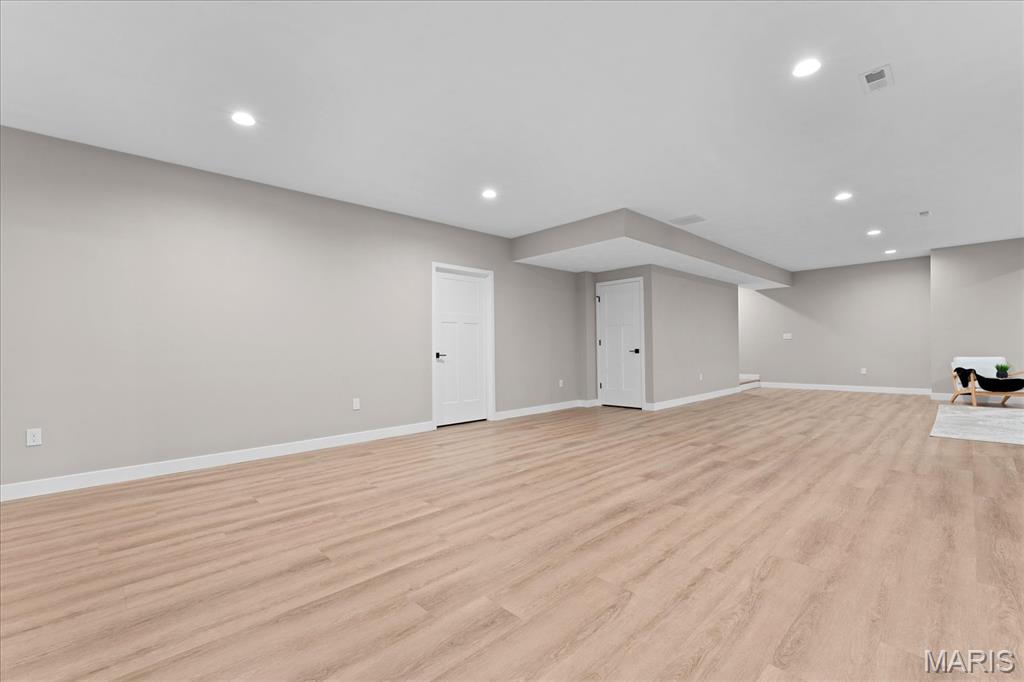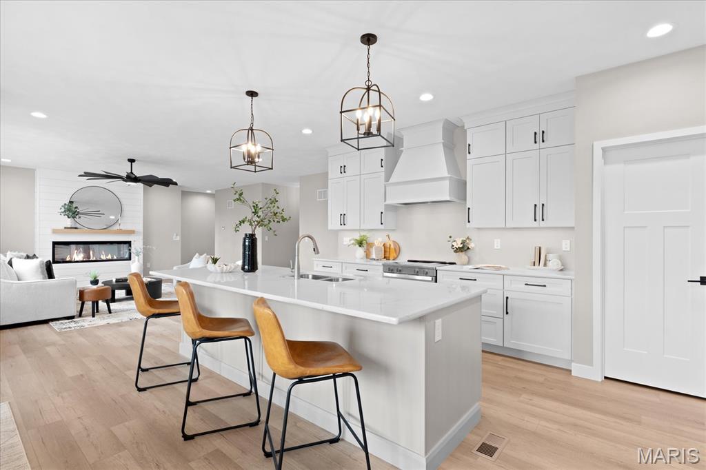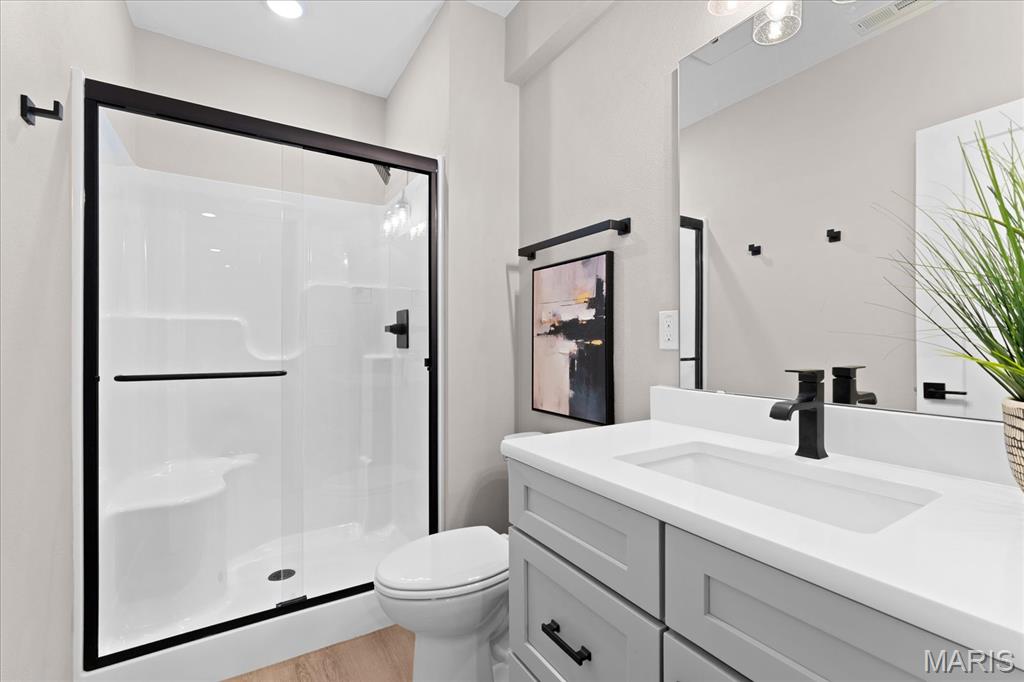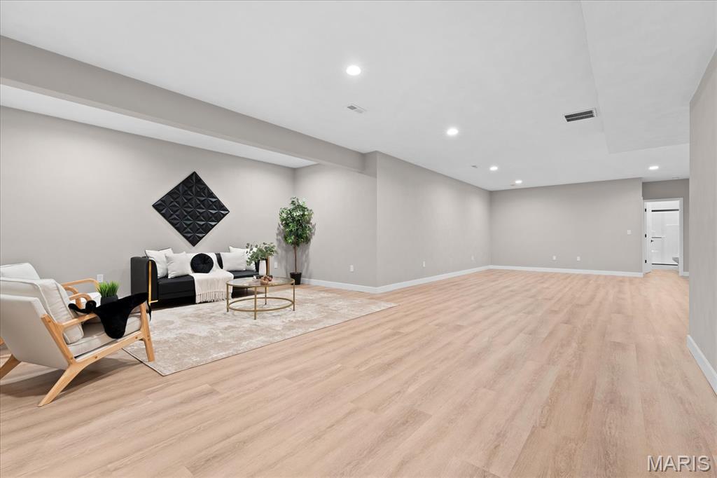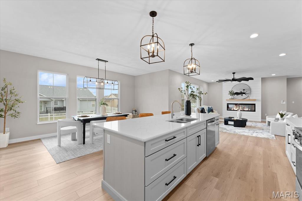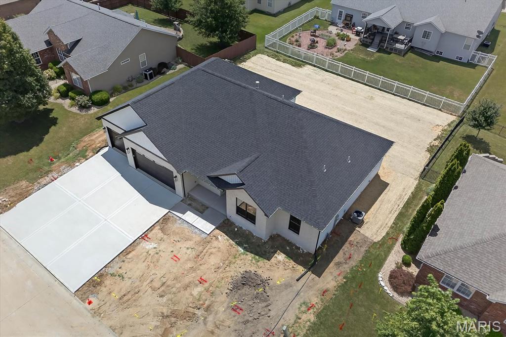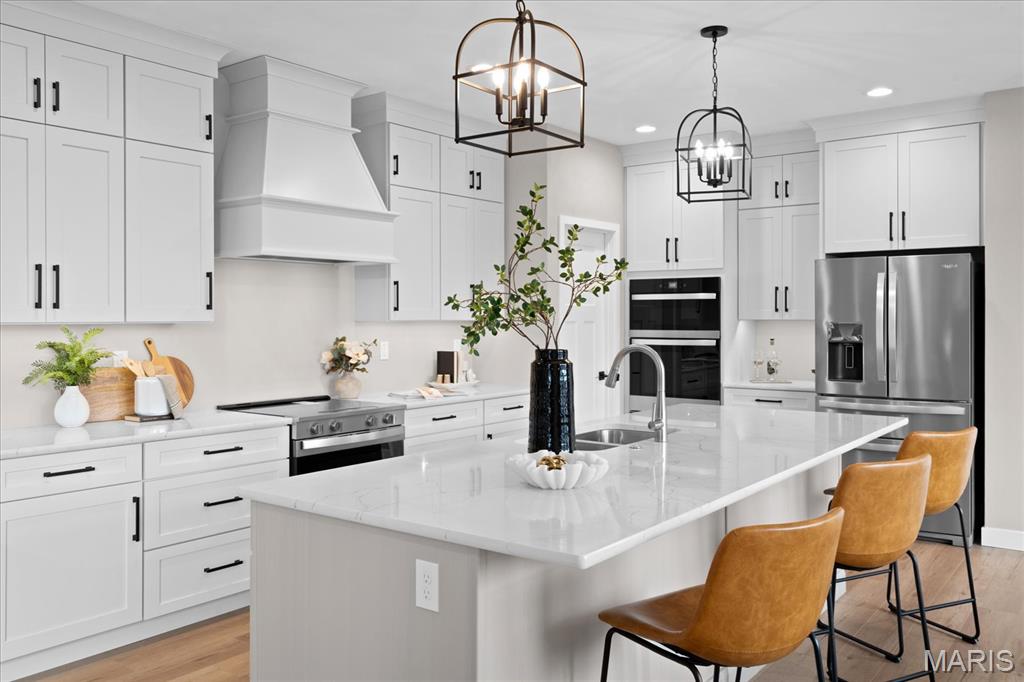 Stunning new construction ranch featuring 4 bedrooms, 3 bathrooms, and a 3-car oversized garage. The crisp white exterior with black accents delivers timeless curb appeal. Step inside this thoughtfully crafted home, to a spacious foyer that opens into a bright and airy living space with luxury vinyl plank flooring throughout and high-end finishes at every turn. The heart of the home is the open kitchen, dining, and living area—bathed in natural light. The show-stopping kitchen boasts floor-to-ceiling custom cabinetry, quartz countertops, a massive island, luxurious hood vent, and a custom walk-in pantry with built-ins. A covered back patio with ceiling fan offers a perfect space to relax or entertain. Off of the massive garage, a mudroom leads to a laundry room with cabinetry, sink, and hanging storage. The primary bedroom features a walk-in closet with custom built-ins, an ensuite bath with a double sink and tile glass shower. Additionally you have two other bedrooms and a full bathroom. The finished lower level adds 900 sq ft of finished living with 9' ceilings, a fourth bedroom, full bath, and storage area. Every inch of this home exudes thoughtful design and quality craftsmanship, don't miss the opportunity to call this home!