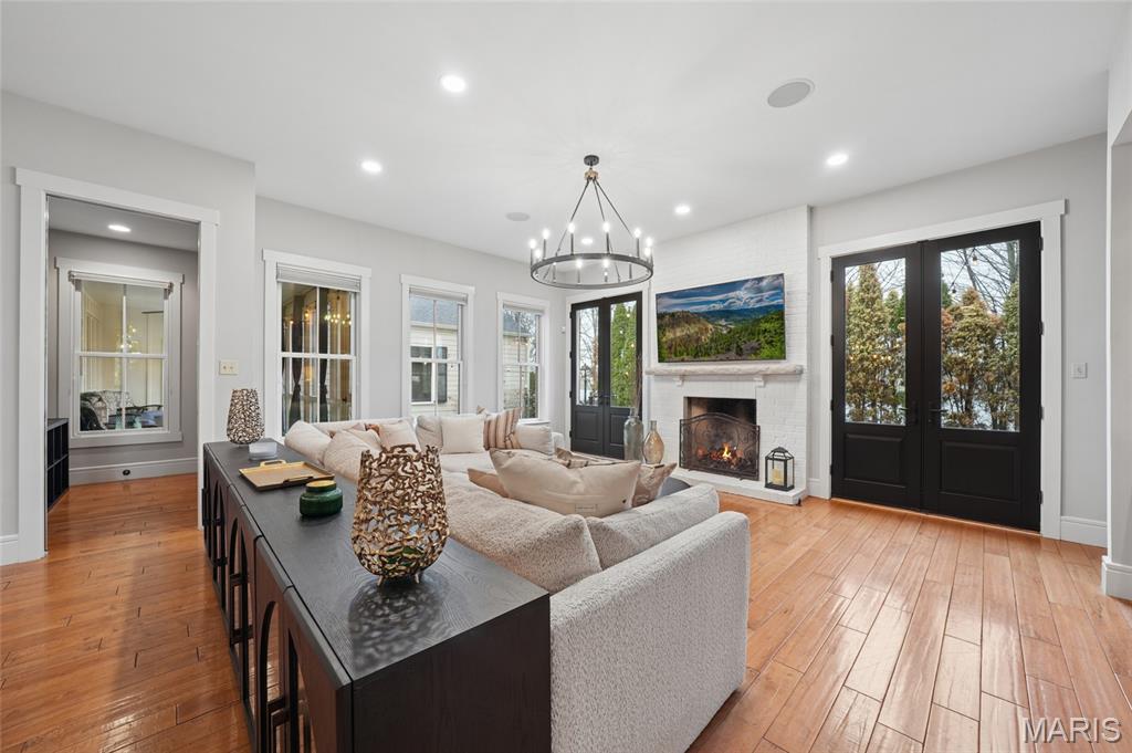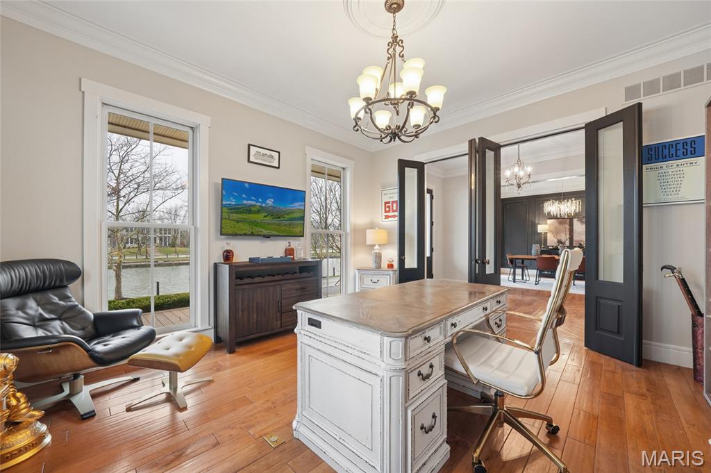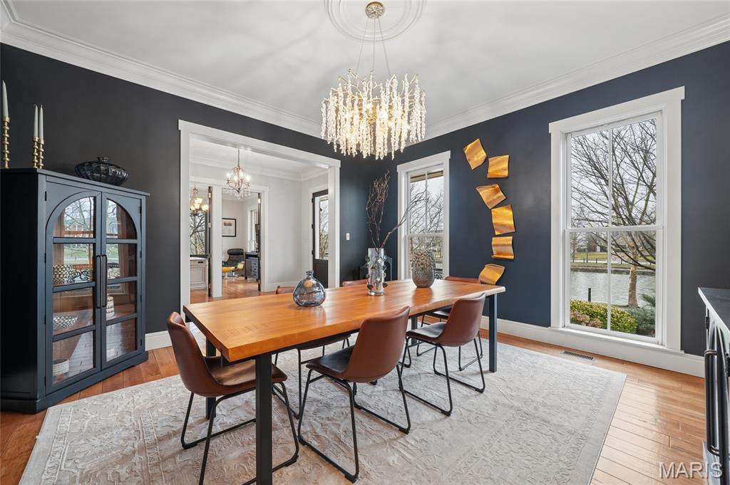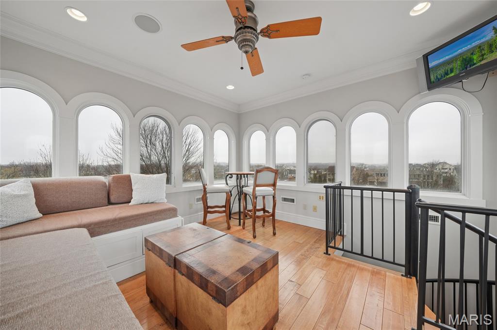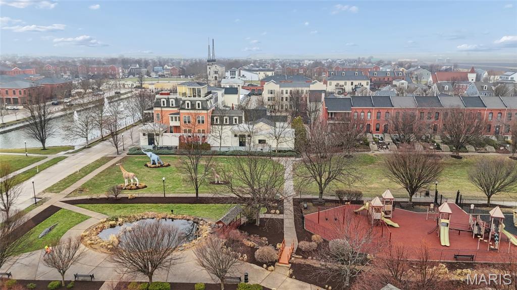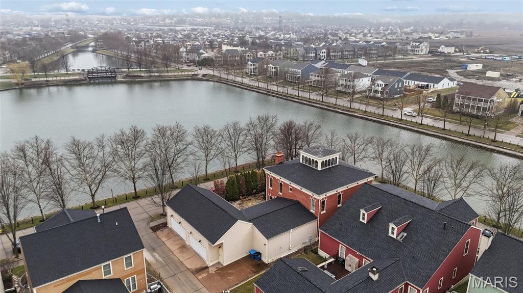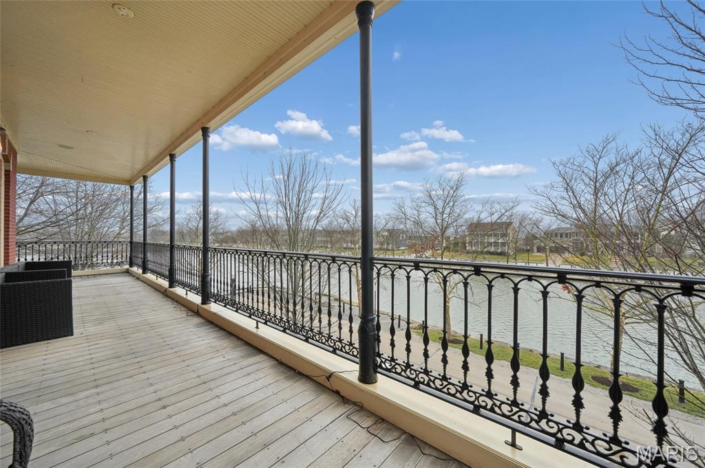 Set on a premier corner waterfront lot, this iconic New Town residence captures some of the finest views in the area. From its double wrap-around porches and private patio to the signature third-floor panoramic sunroom, waterfront and neighborhood vistas unfold in every direction. Recognized for its grand architecture and signature crow’s nest, this custom-built home has long been one of the community’s most admired properties. Take advantage of the rare opportunity to own one of New Town’s true landmark residences. Inside, timeless craftsmanship meets modern luxury. Rich hardwood flooring, fresh millwork, 10’ main-floor ceilings, and updated paint and fixtures set an elegant tone. The great room impresses with built-ins and a beautifully refreshed fireplace. At the heart of the home is a gourmet kitchen made for hosting—complete with custom cabinetry, quartz countertops, Butler’s pantry, center island, wine fridge, and an all-new 2025 Cafe appliance suite including built-in refrigerator, dishwasher, wall oven, warming drawer, and 5-burner gas cooktop. The main-floor primary suite is a serene retreat featuring heated floors, a luxurious marble shower, soaking tub, double vanities, and an oversized walk-in closet. Upstairs, a spacious loft with wet bar, flex space, three bedrooms, two full baths, and a full laundry room offer outstanding functionality. The finished lower level adds even more versatility with three additional finished rooms and a full bath. Outdoors, relax on the screened-in porch or enjoy the peaceful waterfront backdrop from your private patio. A rare 4-car garage with an additional 5th parking pad and EV charger. 4-zone heating system, and laundry hookups on multiple levels every elevate convenience and comfort. What truly sets this home apart is how seamlessly it blends with the vibrant lifestyle of New Town—a community that feels like a little piece of a southern beach town tucked into the Midwest. Here, every day feels like a getaway. Residents enjoy multiple pools (including a lazy river), scenic lakes for fishing and kayaking, sand volleyball courts, walkable restaurants and a neighborhood market, and year-round events and parades that bring the streets to life—often passing right by your front door. It’s a golf-cart community designed for connection, charm, and the kind of everyday moments that feel anything but ordinary. With its iconic architecture, unmatched views, and the best of New Town living woven into every detail, this home is truly one of a kind.