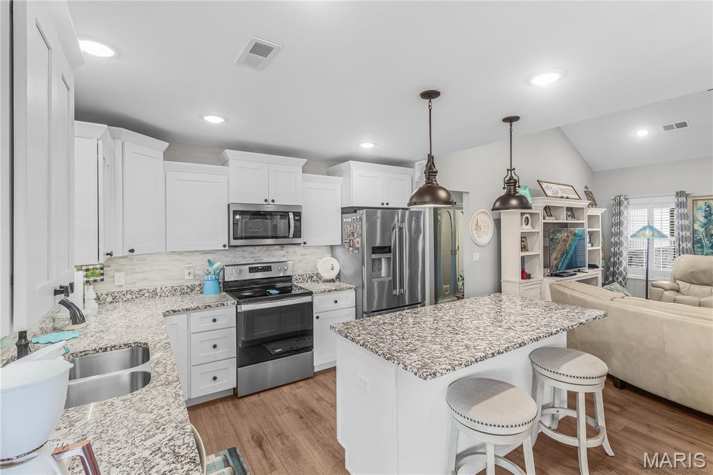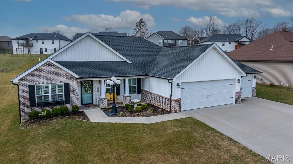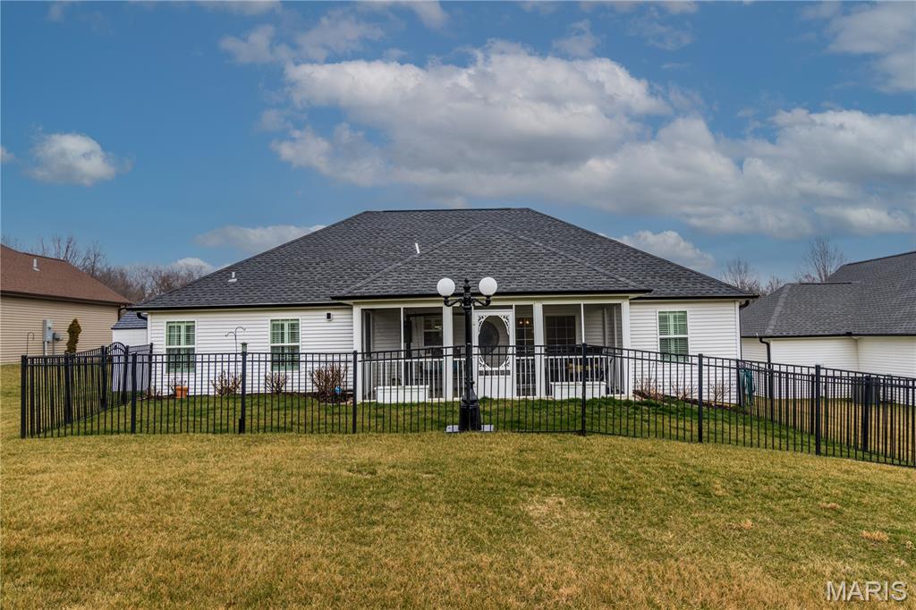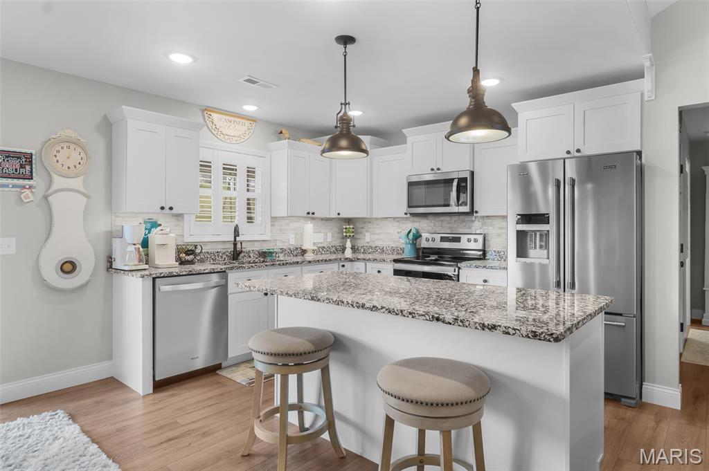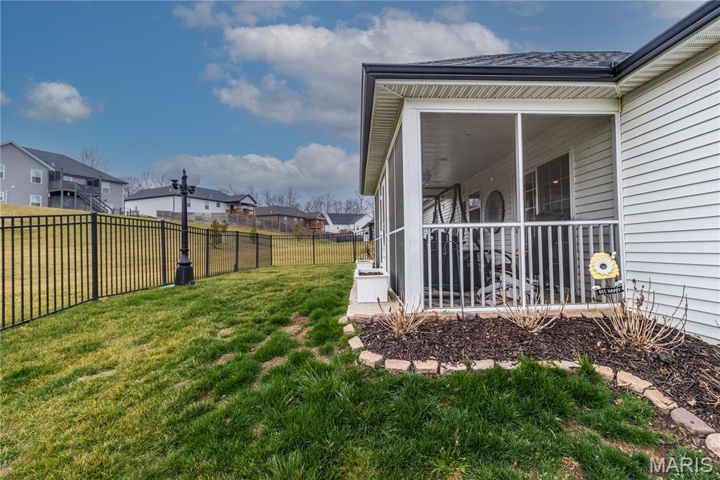 This one still smells new! Only a 5 year old home in a centrally located neighborhood! Charming exterior with Craftsman Style and trendy colors. Natural light is plentiful as you enter the home in the open living area with vaulted ceilings. White kitchen cabinets, stainless steel appliances and large center island, granite countertops and tiled backsplash with separate pantry. Sliding glass doors leading out to the screen porch perfect for morning coffee or evening lounging. The split floor plan with 3 beds and 2 bathrooms is so functional and has nice closet space. Spacious primary suite with tray ceiling and large walk-in closet, master bath with double vanity and walk-in tiled shower. Large 3 car garage for extra storage and large driveway for plenty of parking or turn around to pull out. The covered front porch is set up perfect to decorate for holidays and the backyard is fenced in ready for pets or kiddos and even expands much larger than the fence. Yard is also sodded with sprinkler system the front and back. A great home for anyone looking for a move-in-ready home with quality features with no steps!