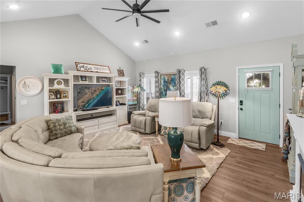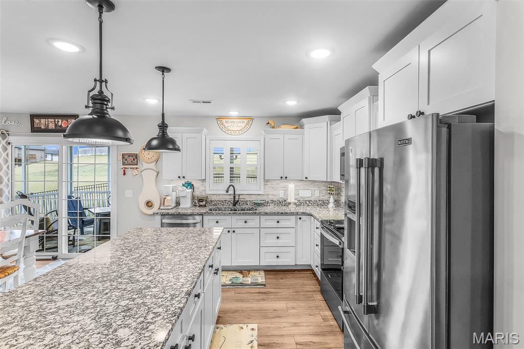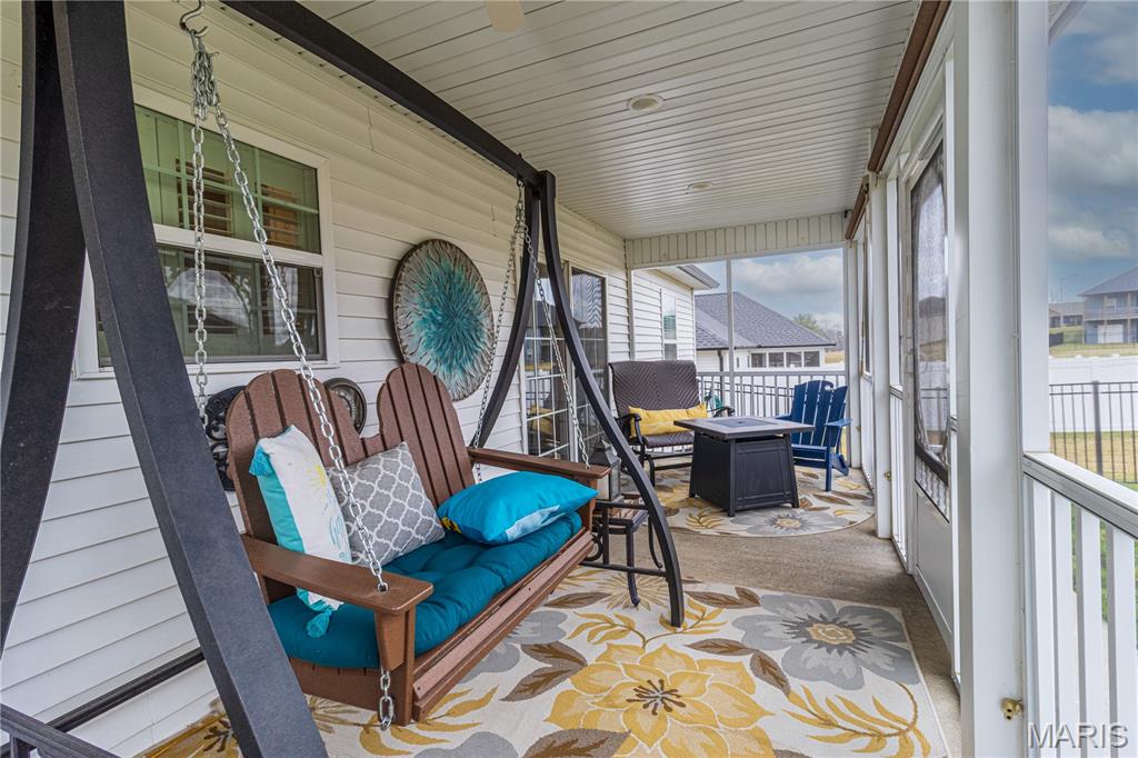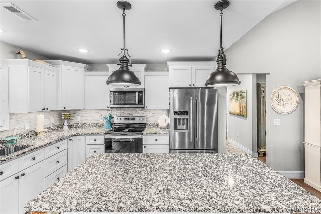 This one still smells new! Only a 5 year old home in a centrally located neighborhood! Charming exterior with Craftsman Style and trendy colors. Natural light is plentiful as you enter the home in the open living area with vaulted ceilings. White kitchen cabinets, stainless steel appliances and large center island, granite countertops and tiled backsplash with separate pantry. Sliding glass doors leading out to the screen porch perfect for morning coffee or evening lounging. The split floor plan with 3 beds and 2 bathrooms is so functional and has nice closet space. Spacious primary suite with tray ceiling and large walk-in closet, master bath with double vanity and walk-in tiled shower. Large 3 car garage for extra storage and large driveway for plenty of parking or turn around to pull out. The covered front porch is set up perfect to decorate for holidays and the backyard is fenced in ready for pets or kiddos and even expands much larger than the fence. Yard is also sodded with sprinkler system the front and back. A great home for anyone looking for a move-in-ready home with quality features with no steps!