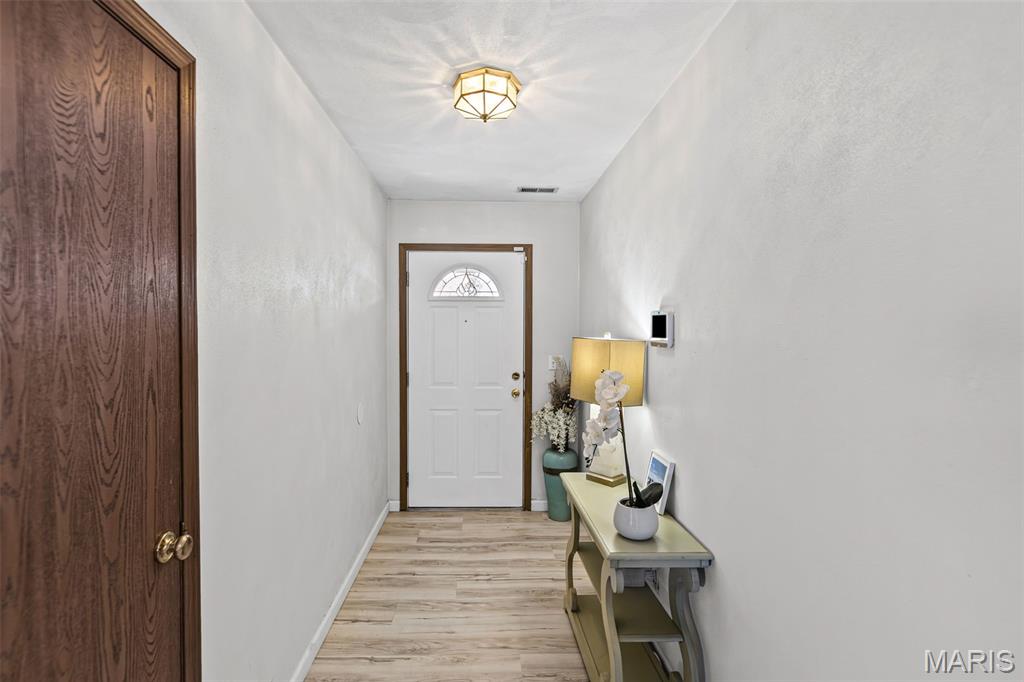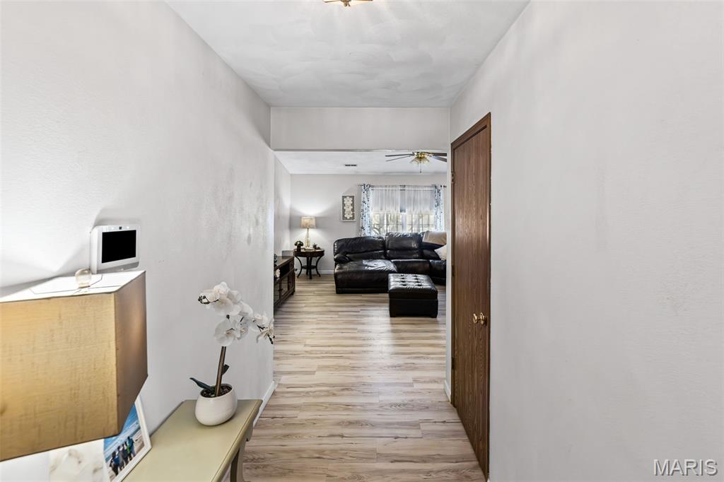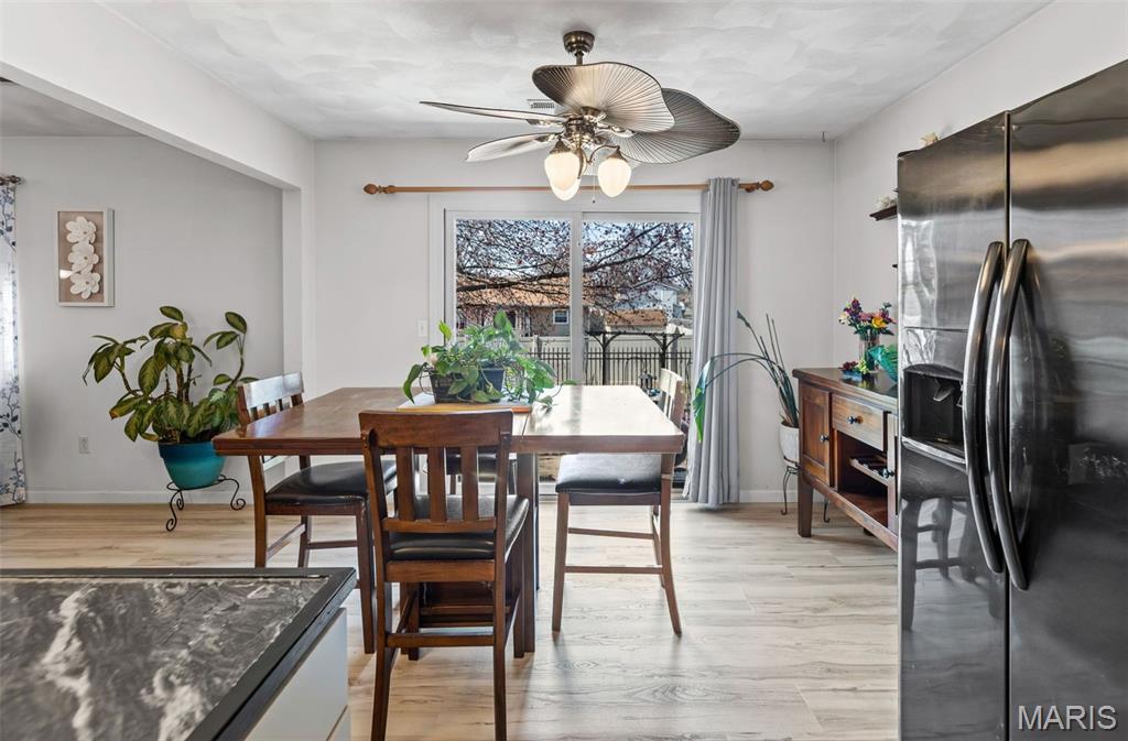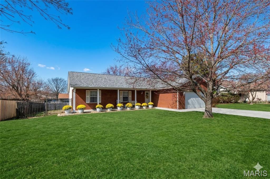 Stylish updates, soaring ceilings, and a backyard designed for relaxing make this beautifully maintained ranch truly inviting. This 3-bedroom, 2-bath ranch offers comfort, thoughtful design, and attractive finishes throughout. The brick and vinyl exterior welcomes you with a charming covered front porch, perfect for enjoying the peaceful neighborhood, along with a 2-car attached garage featuring a newly coated floor for a clean, polished look. Inside, an inviting open floor plan immediately creates a sense of space and warmth. The expansive kitchen and dining area serve as the heart of the home, showcasing a stylish blend of sage and neutral cabinetry, high-contrast countertops, and a large center island with breakfast bar seating. Distinctive design details, including a leaf-blade ceiling fan and sleek linear lighting, add character and a modern touch. The primary suite provides a comfortable retreat with a designer dusty rose accent wall and luxury vinyl plank flooring that flows throughout the home. The bright ensuite bathroom connects to a versatile bonus room, ideal for a dressing space, nursery, or home office. Both bathrooms feature updated finishes that complement the home's modern style. Step outside to a fully fenced backyard offering a private outdoor escape. A large concrete patio is perfect for summer gatherings beneath a mature shade tree, while garden beds and generous green space allow plenty of room for hobbies, gardening, or play. Additional highlights include an Avalon Water System (included as-is), a recently replaced roof (2024), regularly serviced furnace with new heating element and flooring updated in 2024 . The HVAC system and water heater were previously replaced, and kitchen appliances are included. Conveniently located near Scott Air Force Base, with easy access to local dining, shopping, and the interstate. School District: Whiteside School District & Belleville East High School.