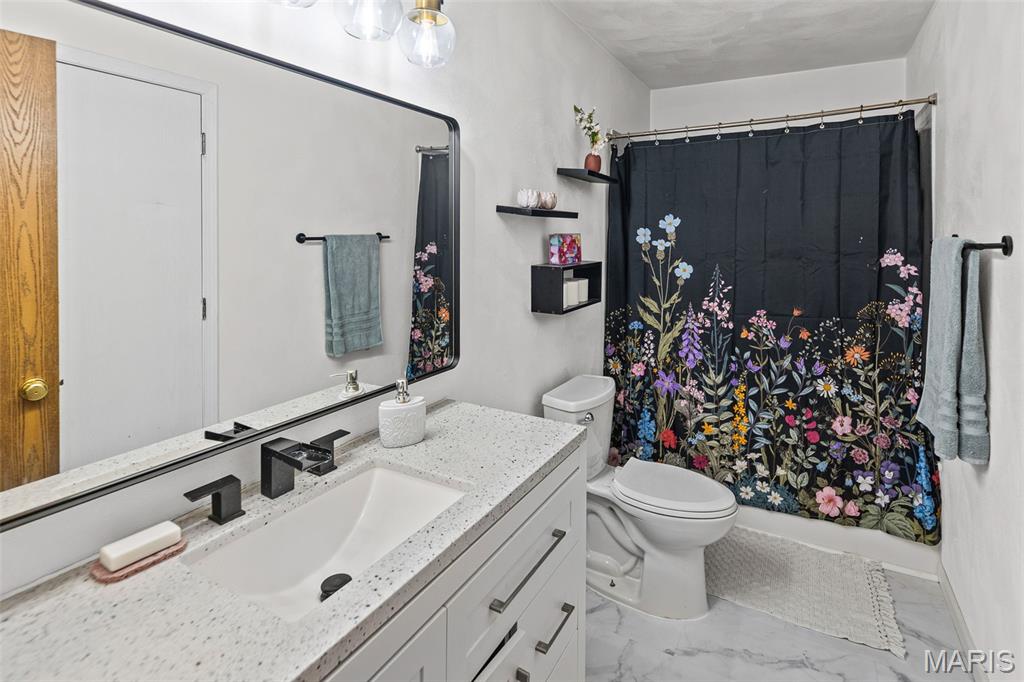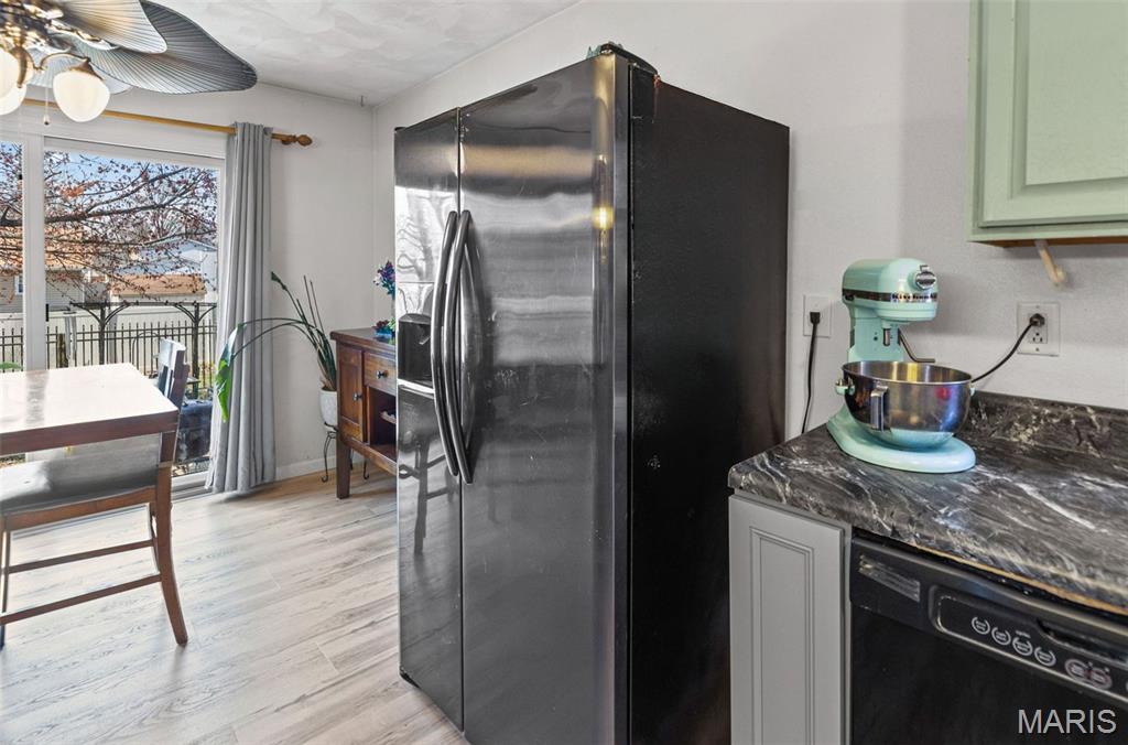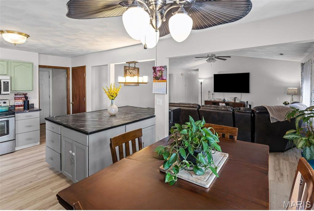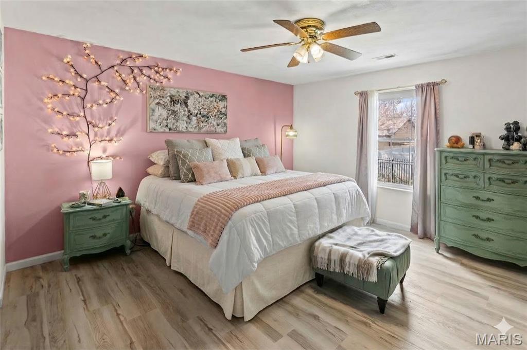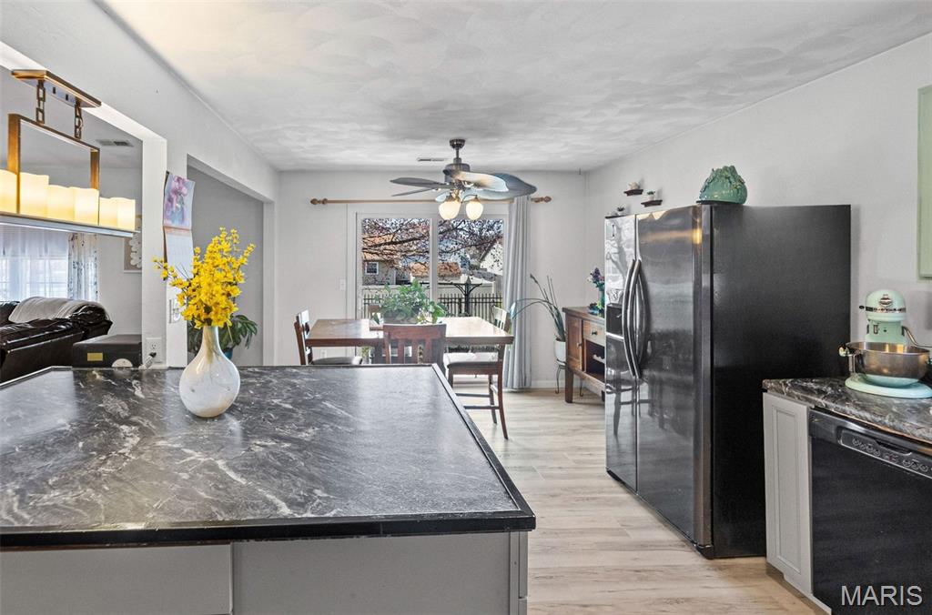 Stylish updates, soaring ceilings, and a backyard designed for relaxing make this beautifully maintained ranch truly inviting. This 3-bedroom, 2-bath ranch offers comfort, thoughtful design, and attractive finishes throughout. The brick and vinyl exterior welcomes you with a charming covered front porch, perfect for enjoying the peaceful neighborhood, along with a 2-car attached garage featuring a newly coated floor for a clean, polished look. Inside, an inviting open floor plan immediately creates a sense of space and warmth. The expansive kitchen and dining area serve as the heart of the home, showcasing a stylish blend of sage and neutral cabinetry, high-contrast countertops, and a large center island with breakfast bar seating. Distinctive design details, including a leaf-blade ceiling fan and sleek linear lighting, add character and a modern touch. The primary suite provides a comfortable retreat with a designer dusty rose accent wall and luxury vinyl plank flooring that flows throughout the home. The bright ensuite bathroom connects to a versatile bonus room, ideal for a dressing space, nursery, or home office. Both bathrooms feature updated finishes that complement the home's modern style. Step outside to a fully fenced backyard offering a private outdoor escape. A large concrete patio is perfect for summer gatherings beneath a mature shade tree, while garden beds and generous green space allow plenty of room for hobbies, gardening, or play. Additional highlights include an Avalon Water System (included as-is), a recently replaced roof (2024), regularly serviced furnace with new heating element and flooring updated in 2024 . The HVAC system and water heater were previously replaced, and kitchen appliances are included. Conveniently located near Scott Air Force Base, with easy access to local dining, shopping, and the interstate. School District: Whiteside School District & Belleville East High School.