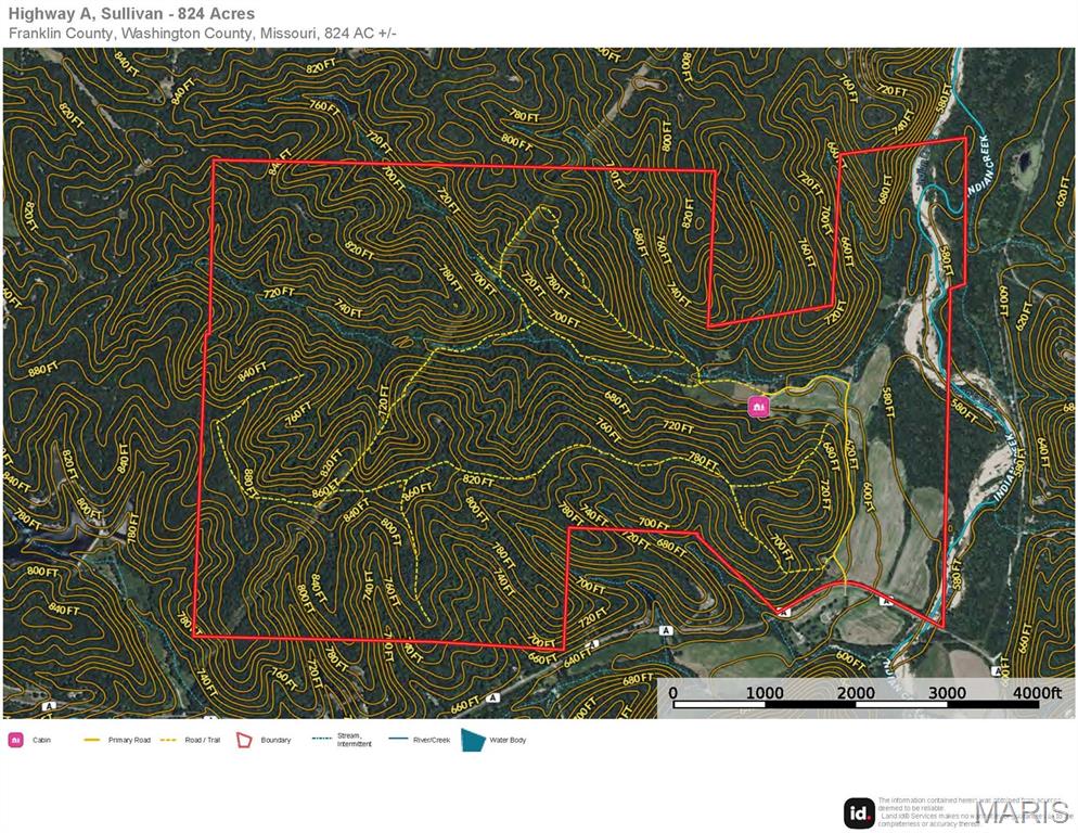 More acreage added—now 824± acres! Enjoy massive gravel bars on the highly sought-after Indian Creek, with over a half mile of creek frontage and property on both sides. Also new to this listing is approximately 40 acres of tillable land, making an already great hunting property even better. With expansive ridgetops running the length of the property and over six miles of established trails, the land is remarkably accessible. Multiple creeks meander through the landscape, providing year-round natural water sources for wildlife. Located just 15 minutes from Sullivan and less than 90 minutes from St. Louis, this extraordinary 824± acre tract is a dream come true for deer hunters and outdoor enthusiasts. Several parks and conservation areas are nearby, including Meramec State Park, which offers public access to the Meramec River. Schedule a showing today!
