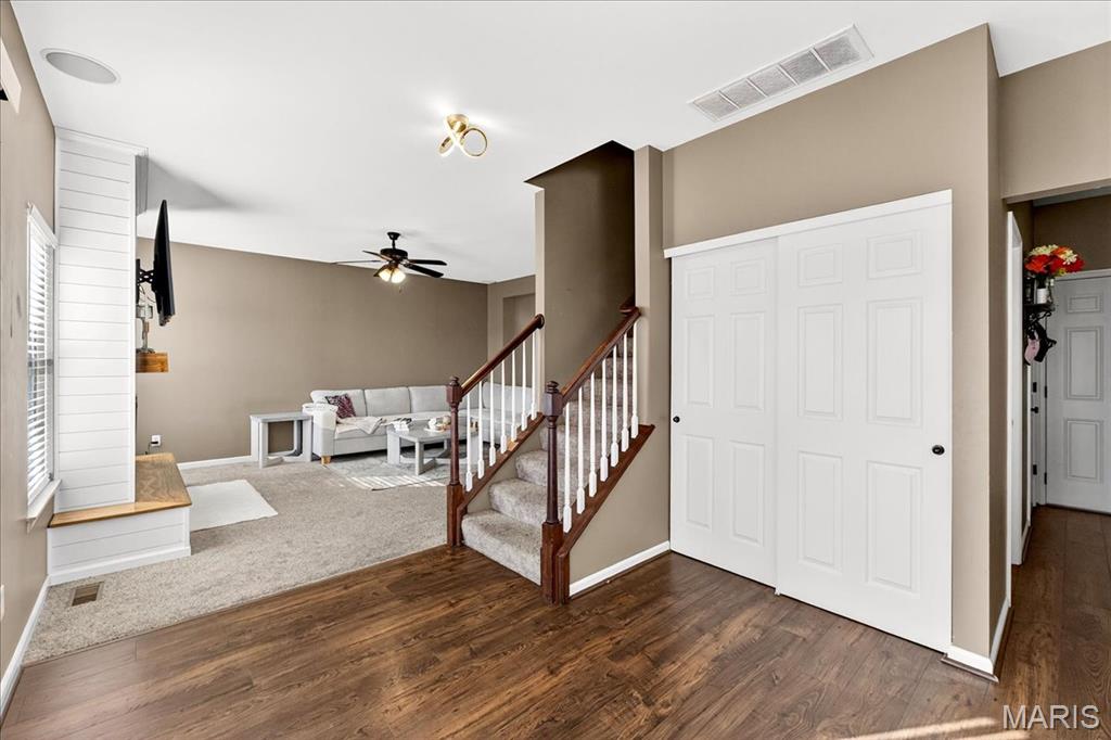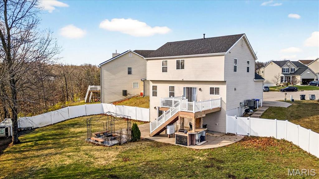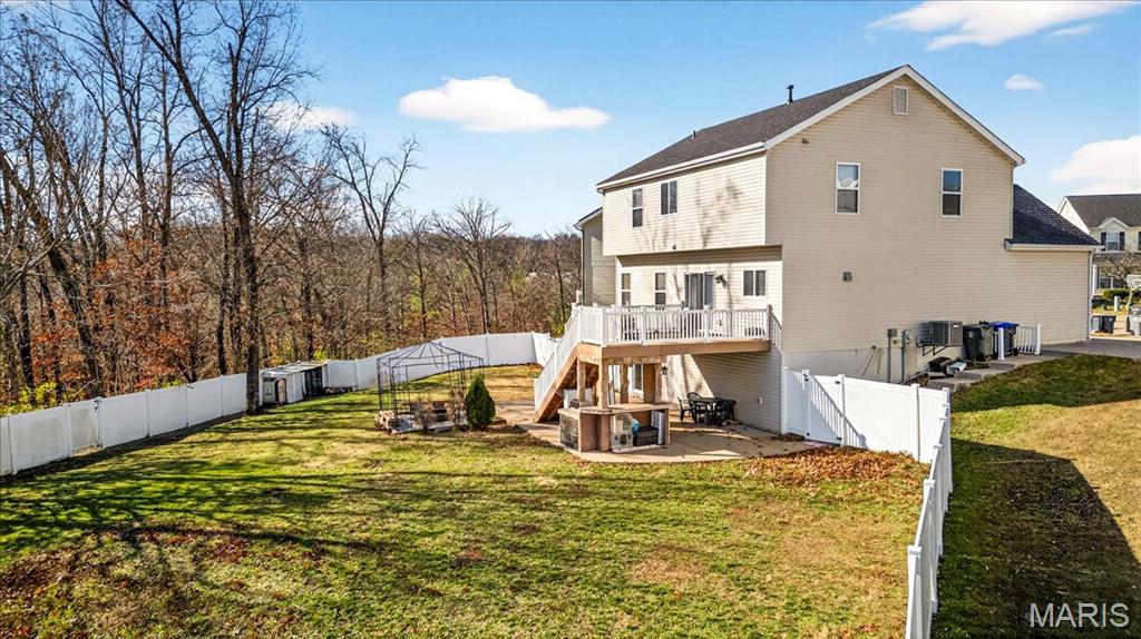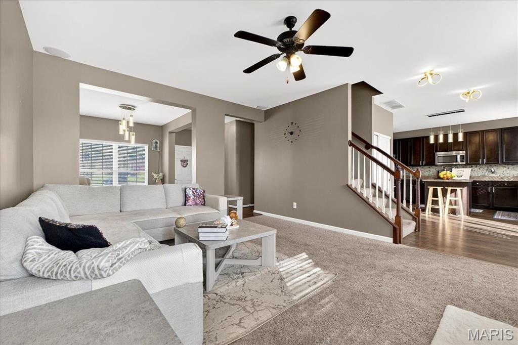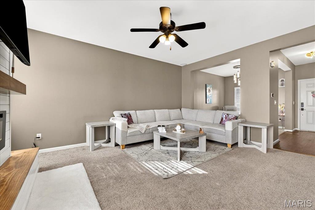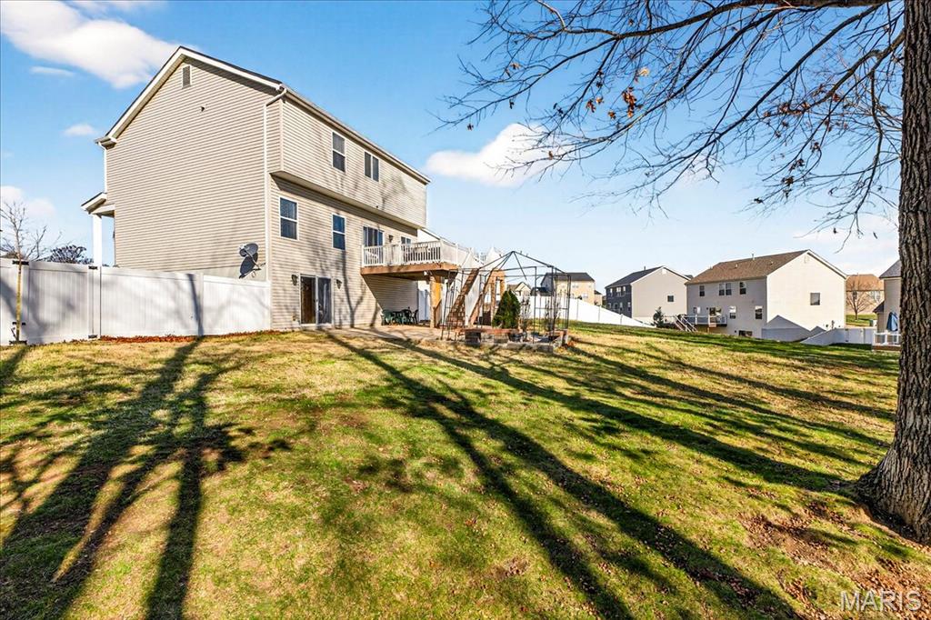 Set on a quiet cul-de-sac, this O’Fallon home delivers a spacious layout, tall ceilings, and a large fenced backyard that immediately stands out. The interior offers comfortable, functional living with multiple areas to spread out across all levels. The main floor centers around an open living area with tall ceilings and an electric fireplace. The kitchen and dining spaces flow directly to the back deck and patio, creating an easy connection to the yard and providing room for outdoor cooking or everyday gatherings. Upstairs, the large primary bedroom includes two walk-in closets and its own electric fireplace. The upper level also features a bonus common area suitable for an office, reading space, or additional lounge area. The unfinished basement provides substantial storage with the option to expand and finish if desired. Outside, the deep, fenced yard adds privacy and usable outdoor space. Feel free to reach out with any questions or to arrange a showing.