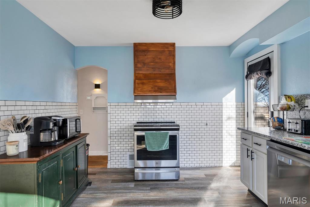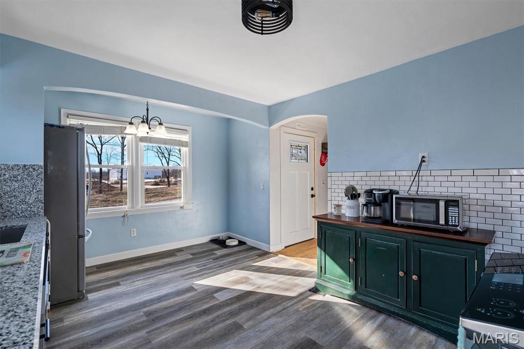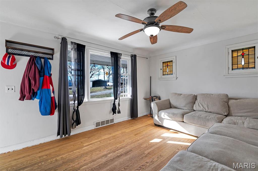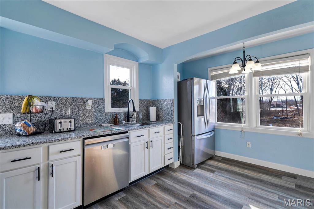 Cute Starter home in convenient High Ridge location on over an acre! This home features a newly renovated kitchen with new cabinets, new granite counters and backsplashes, fresh stainless appliances and new laminate flooring! The rest of the main floor has beautifully aged hardwood and stained glass for character, arched doorways, a large picture window, generous room sizes and offers a warm and cozy feel! Outside offers maintenance free vinyl siding, covered front porch, large deck for entertaining and an amazing back yard for the kiddos. Don't miss out on this hidden little gem.