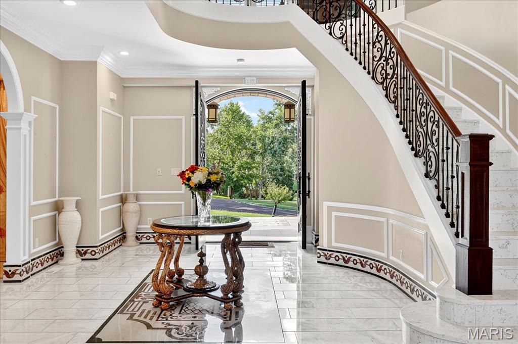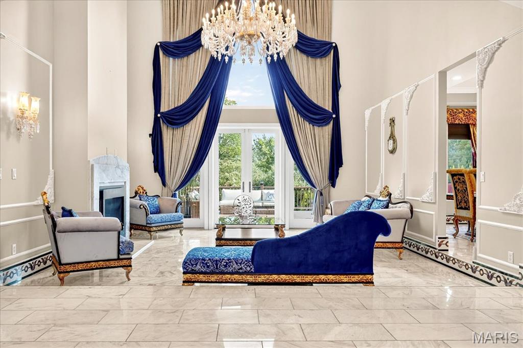 Set on a beautifully landscaped one acre lot in the sought after Thornhill Estates, this magnificent seven bedroom, eight and a half bath residence offers nearly ten thousand square feet of refined living. Built in 2017, the home combines modern comfort with timeless design and meticulous craftsmanship. Every detail, from the imported marble flooring and custom medallions to the handcrafted furnishings tailored specifically for this residence, reflects an uncompromising commitment to quality. A roundabout driveway leads to the elegant entry and a four car garage with two covered carports. Inside, the foyer opens to soaring ceilings on the main level, introducing an atmosphere of grandeur that continues throughout. Imported marble flooring with matching trim, intricate ceiling designs, and imported chandeliers establish a tone of elegance from the first step. The great room serves as the heart of the main level, anchored by tall ceilings and expansive windows that fill the space with natural light. From here, doors open to a grand wood deck overlooking the pool and manicured grounds, creating a seamless connection between indoor and outdoor living. The gourmet kitchen was designed for both entertaining and daily enjoyment. It features three tiered velvet edged marble countertops, custom cabinetry, and top of the line appliances. The generous island and breakfast area make this space both practical and beautiful. Just beyond the kitchen, a hearth room with its own medallion ceiling and chandelier offers a warm and inviting setting for relaxed gatherings. Across the hall, the formal dining room mirrors that same attention to detail, highlighted by its own medallion centerpiece and chandelier, creating an elegant space for memorable dinners. Also on the main floor is a private office or den, perfect for use as a secondary living room, study, or library. The main floor master suite is a peaceful retreat, offering a spa inspired bathroom with dual vanities, soaking tub, and walk in shower. A spacious custom closet provides ample storage, while a large bay window captures breathtaking views of the property, filling the suite with light and tranquility. Beyond the master suite, the main floor includes two additional bedrooms, each with its own private bathroom, offering comfort and privacy for family or guests. Upstairs, the sense of openness continues with a grand loft that overlooks the great room below, creating a striking architectural feature. Two bedrooms on this level include private balconies that offer elevated views of the surrounding landscape. Each bedroom throughout the home includes its own ensuite bath, ensuring every resident enjoys the same level of comfort. A convenient laundry room on this floor complements the additional laundry on the main level. The lower level extends the home’s versatility with a full secondary kitchen, a large living room centered around a stunning onyx fireplace, and a state of the art theatre room for an immersive entertainment experience. A dedicated gym area provides space for personal fitness, while two adjoining rooms are ready to be finished as a steam room and sauna, allowing the next owner to create a complete spa environment. For effortless poolside living, a separate pool storage and cleaning area includes a full bathroom, providing convenience for guests before reentering the home. The resort style pool is surrounded by generous patios perfect for outdoor dining, lounging, or entertaining. Mature landscaping ensures privacy and natural beauty year round. Every element of this home reflects thoughtful design and enduring craftsmanship. From the marble floors and medallioned ceilings to the custom furnishings and resort style amenities, this residence is a statement of luxury and comfort. With its commanding presence and one of the most desirable addresses in the area, this Thornhill Estates estate represents refined living at its finest.