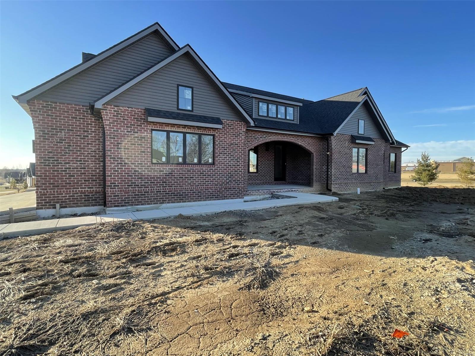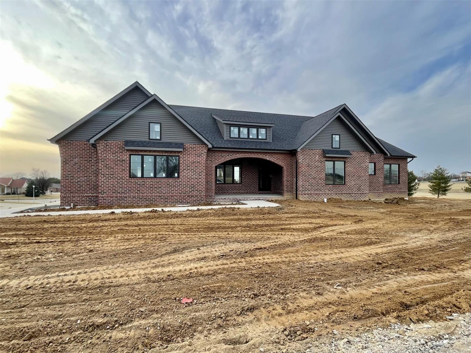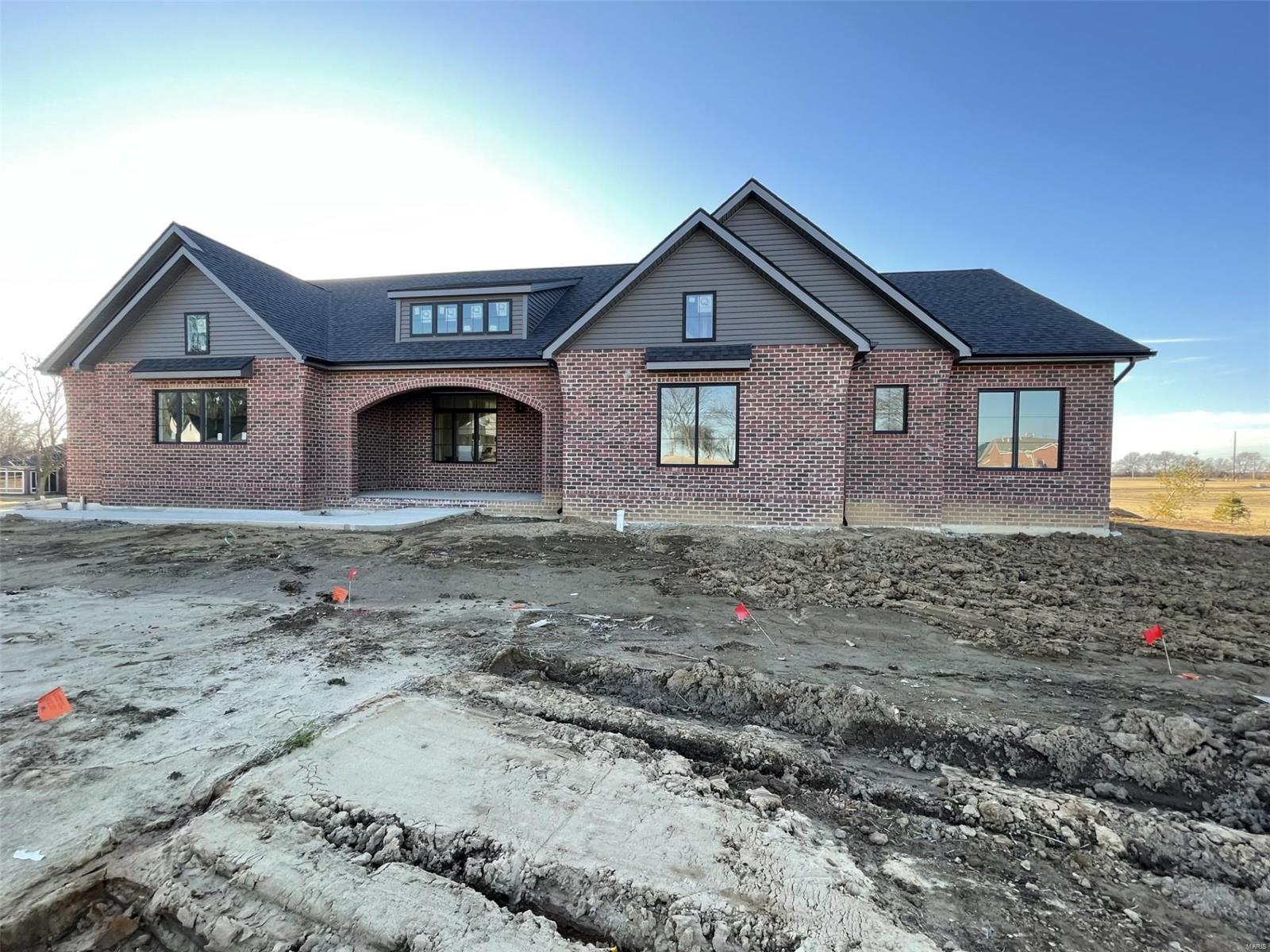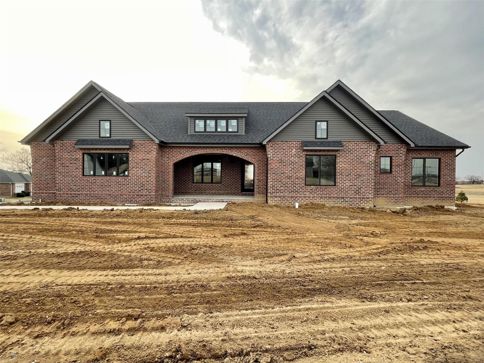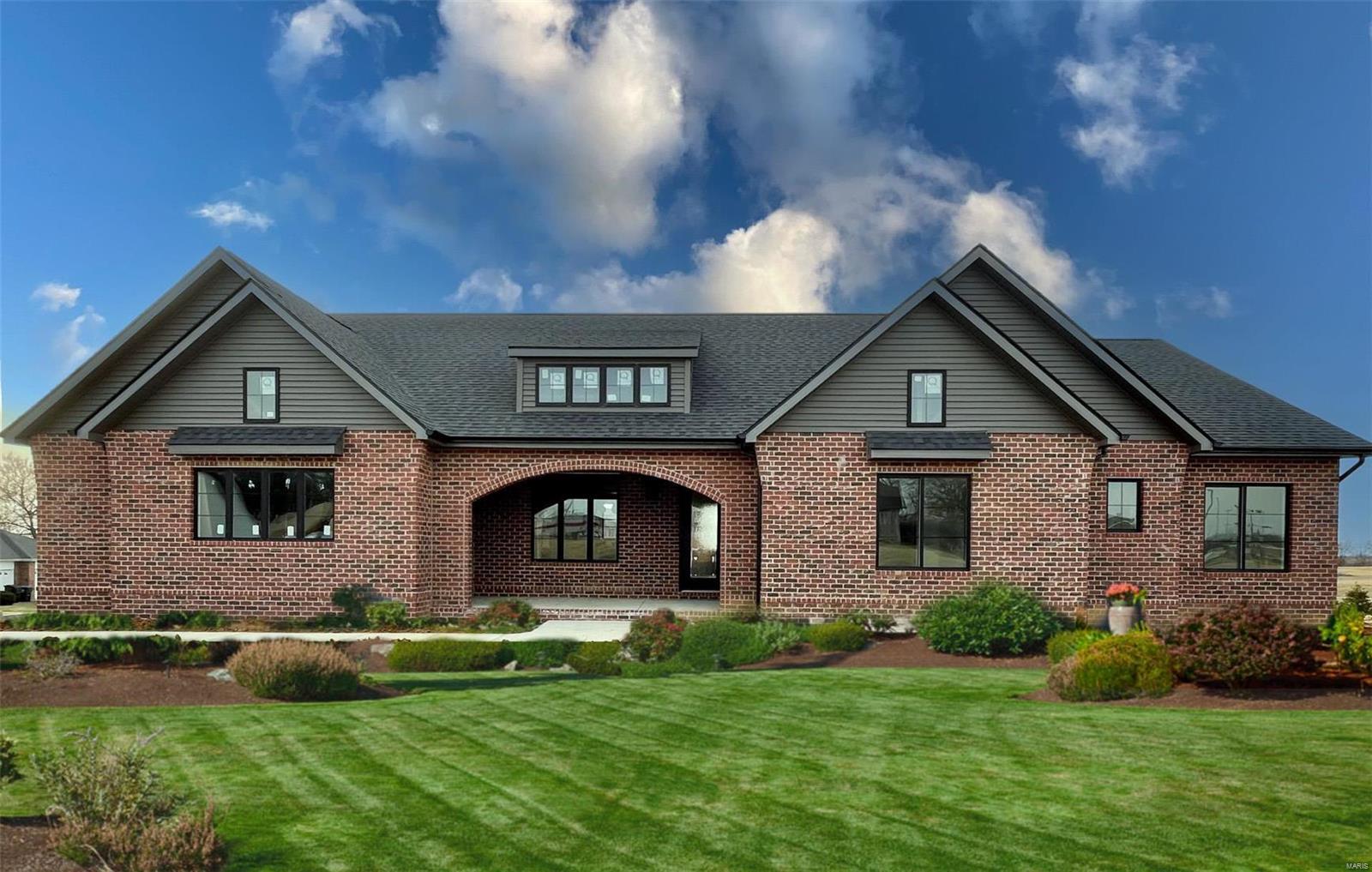 A Truly custom new construction home with one-of-a-kind floor plan. 4BR, 3 BA all brick ranch w/ premium black windows & 3 1/2 car (workshop or storage) side entry finished garage. Stamped concrete covered front porch. Open floor plan w/ chic finishes. 11’ tall Great Room ceiling w/ built ins both sides of fantastic modern linear fireplace. 8’ tall x 9’ wide patio door leads to brick edged rear covered patio. Kitchen has 8.5’ long island, pull out trash cabinet, custom hood vent, mixed wood cabinets w/ hardware, fantastic arch framing workstation sink under large window. luxurious veined Quartz countertop and backsplash. Deep walk-in pantry off mudroom. Main level primary suite w/ designer ceiling, vestibule to large walk in closet & primary bath w/ double sink & spa-like tile walk in shower. 2 other spacious bedrooms with wic, bath and laundry. Full basement w/ 3 egress windows, spacious family room, bed 4, 3rd bath, 2 unfinished rooms, and 9' pour. Grass seeded & appliance allowance.