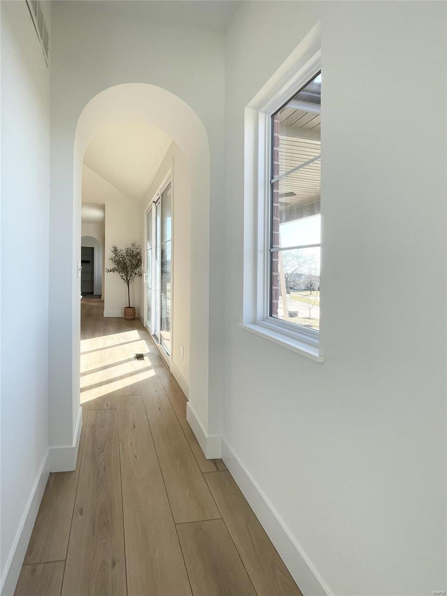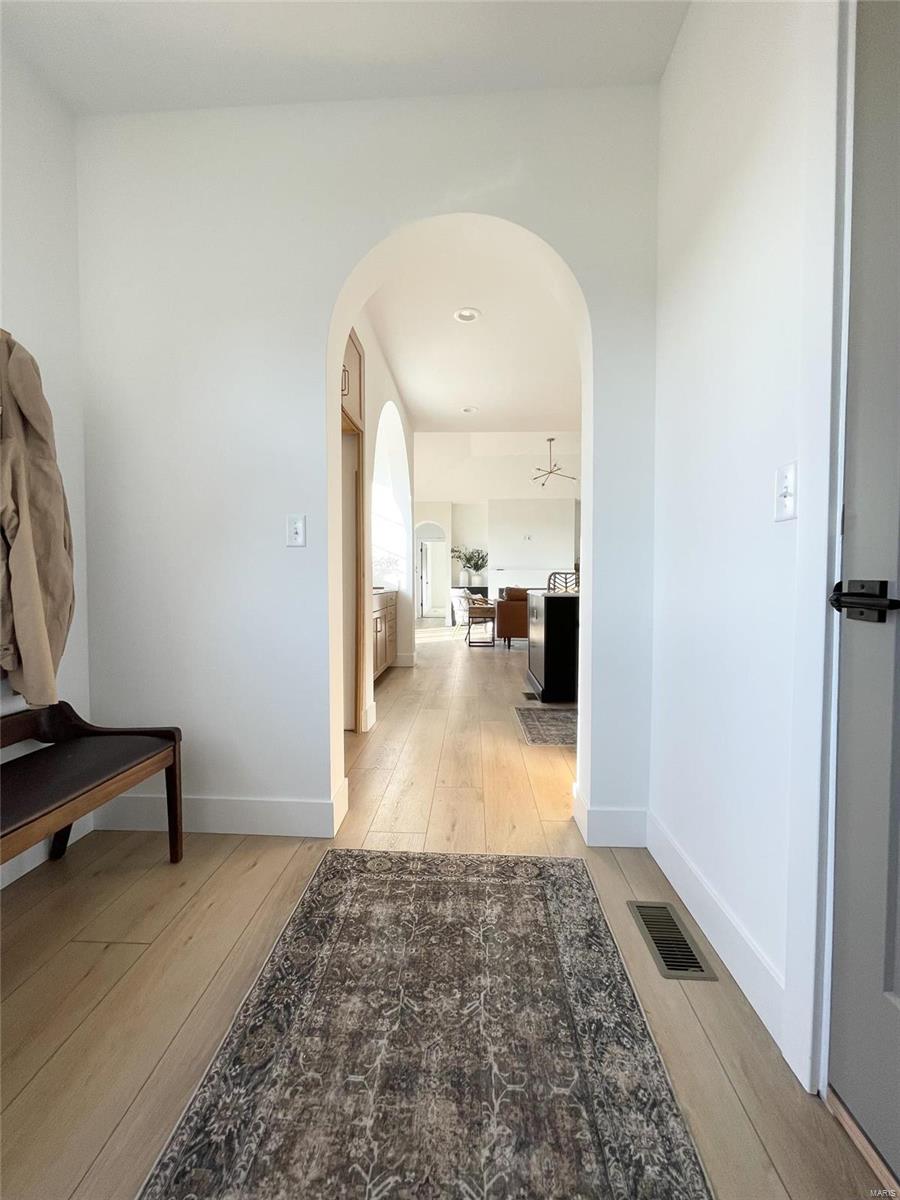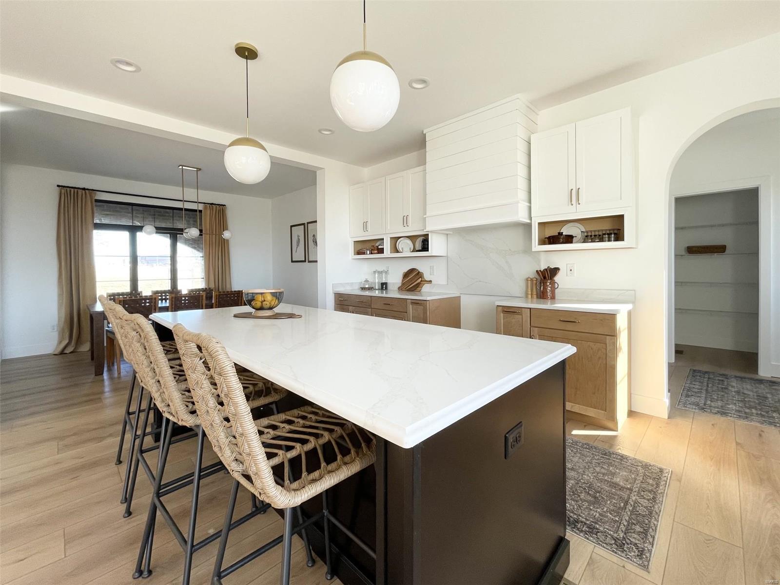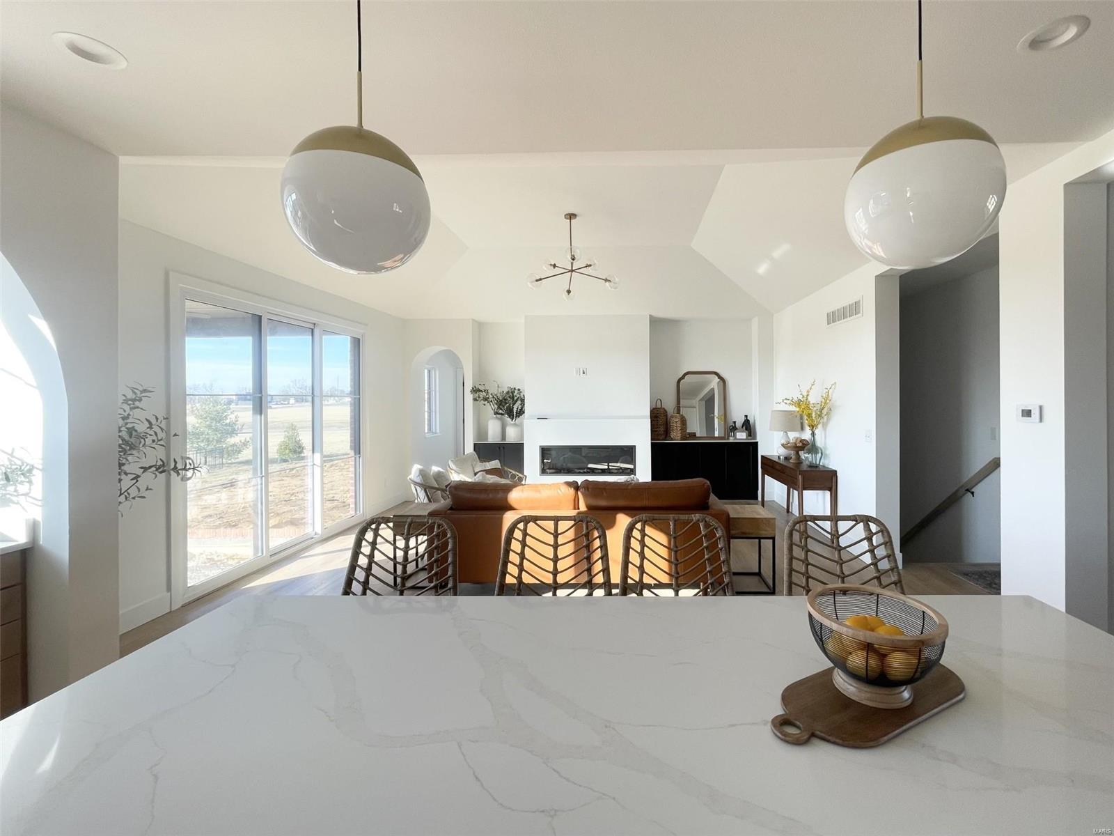 A Truly custom new construction home with one-of-a-kind floor plan. 4BR, 3 BA all brick ranch w/ premium black windows & 3 1/2 car (workshop or storage) side entry finished garage. Stamped concrete covered front porch. Open floor plan w/ chic finishes. 11’ tall Great Room ceiling w/ built ins both sides of fantastic modern linear fireplace. 8’ tall x 9’ wide patio door leads to brick edged rear covered patio. Kitchen has 8.5’ long island, pull out trash cabinet, custom hood vent, mixed wood cabinets w/ hardware, fantastic arch framing workstation sink under large window. luxurious veined Quartz countertop and backsplash. Deep walk-in pantry off mudroom. Main level primary suite w/ designer ceiling, vestibule to large walk in closet & primary bath w/ double sink & spa-like tile walk in shower. 2 other spacious bedrooms with wic, bath and laundry. Full basement w/ 3 egress windows, spacious family room, bed 4, 3rd bath, 2 unfinished rooms, and 9' pour. Grass seeded & appliance allowance.