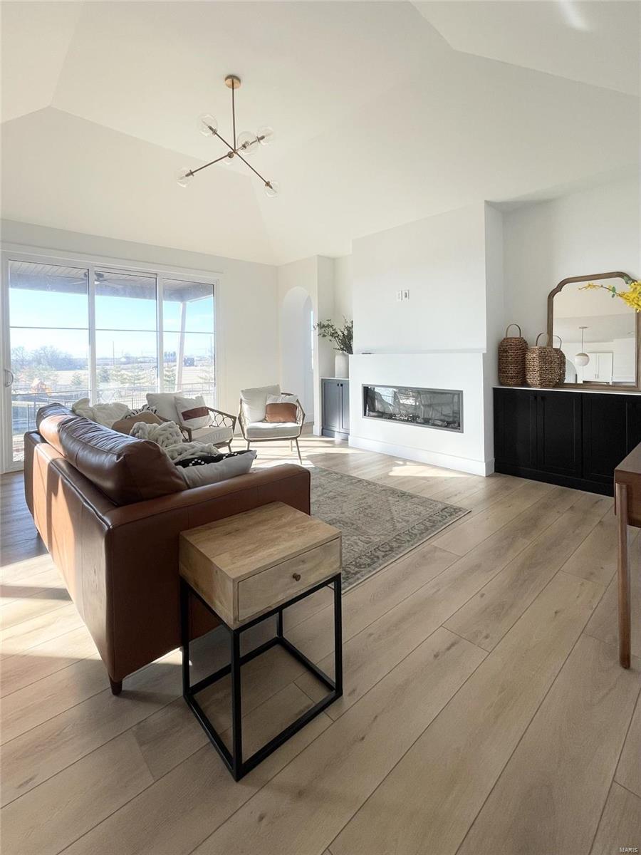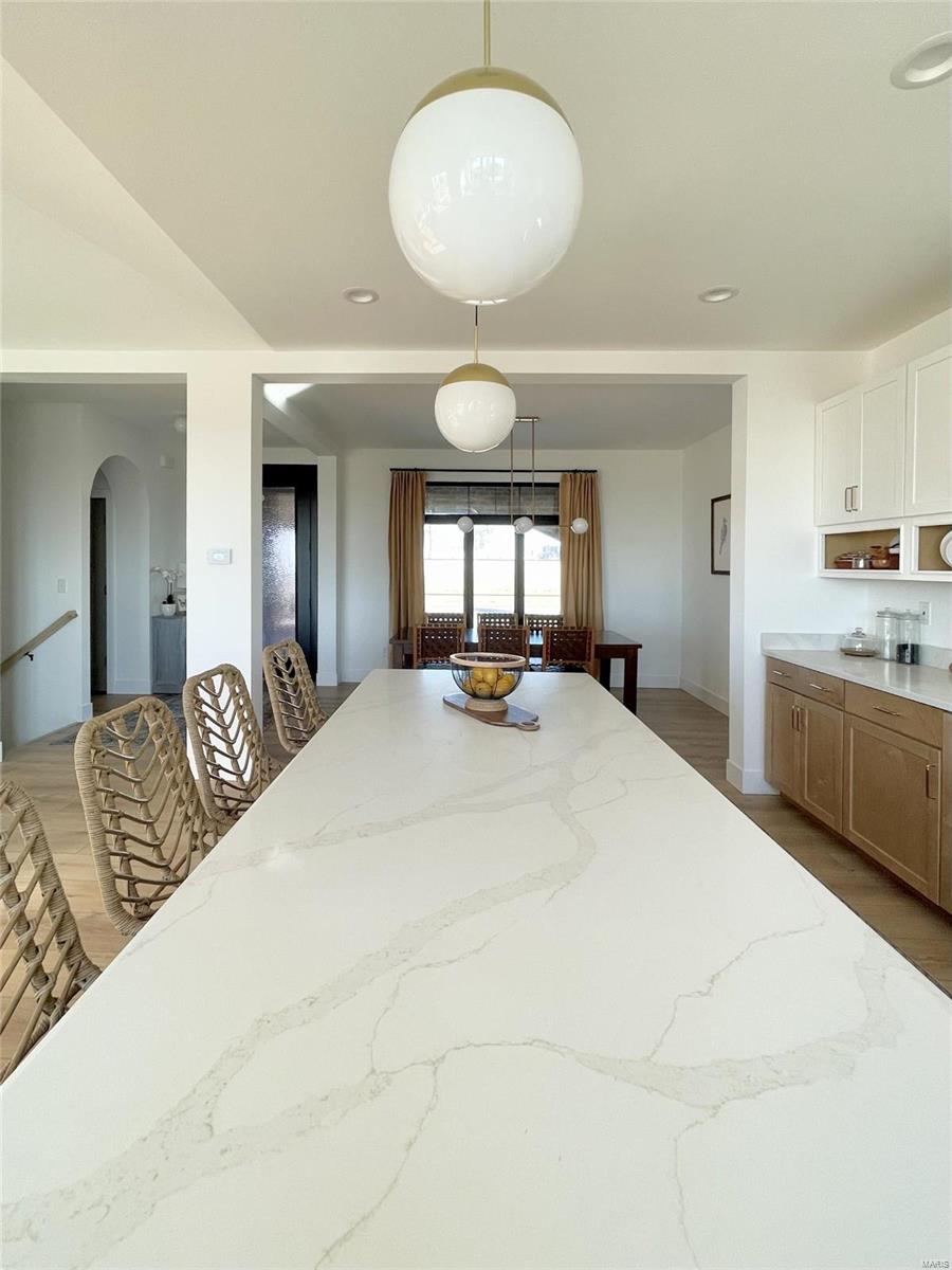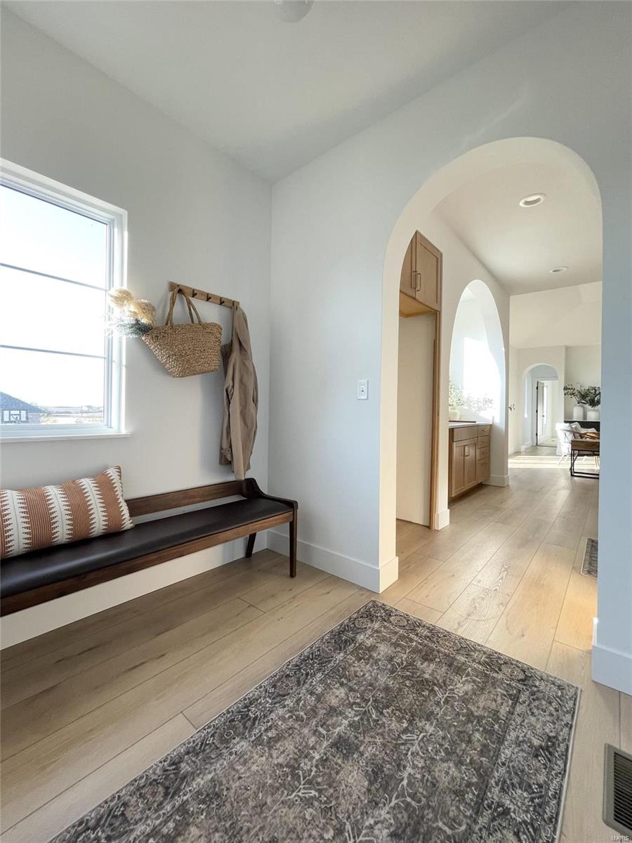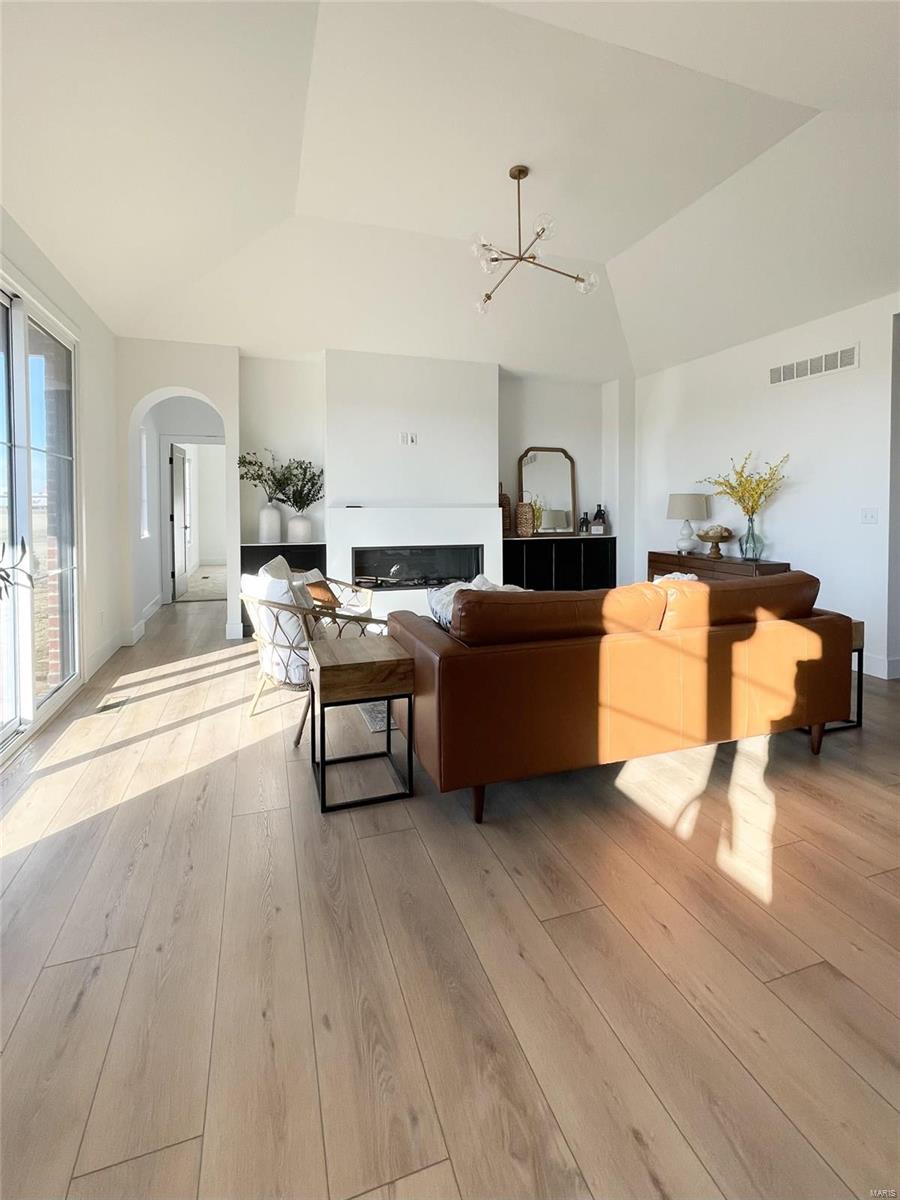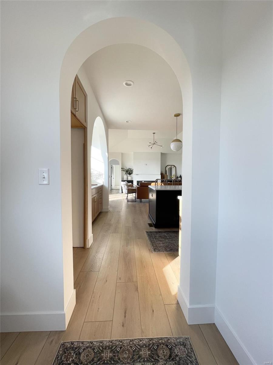 A Truly custom new construction home with one-of-a-kind floor plan. 4BR, 3 BA all brick ranch w/ premium black windows & 3 1/2 car (workshop or storage) side entry finished garage. Stamped concrete covered front porch. Open floor plan w/ chic finishes. 11’ tall Great Room ceiling w/ built ins both sides of fantastic modern linear fireplace. 8’ tall x 9’ wide patio door leads to brick edged rear covered patio. Kitchen has 8.5’ long island, pull out trash cabinet, custom hood vent, mixed wood cabinets w/ hardware, fantastic arch framing workstation sink under large window. luxurious veined Quartz countertop and backsplash. Deep walk-in pantry off mudroom. Main level primary suite w/ designer ceiling, vestibule to large walk in closet & primary bath w/ double sink & spa-like tile walk in shower. 2 other spacious bedrooms with wic, bath and laundry. Full basement w/ 3 egress windows, spacious family room, bed 4, 3rd bath, 2 unfinished rooms, and 9' pour. Grass seeded & appliance allowance.